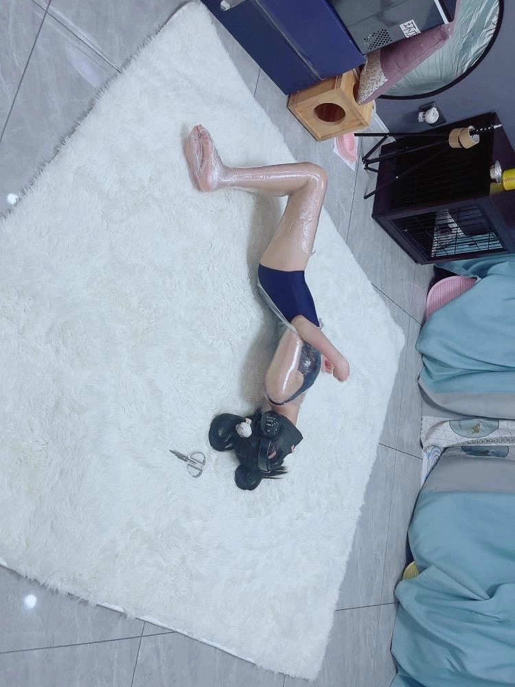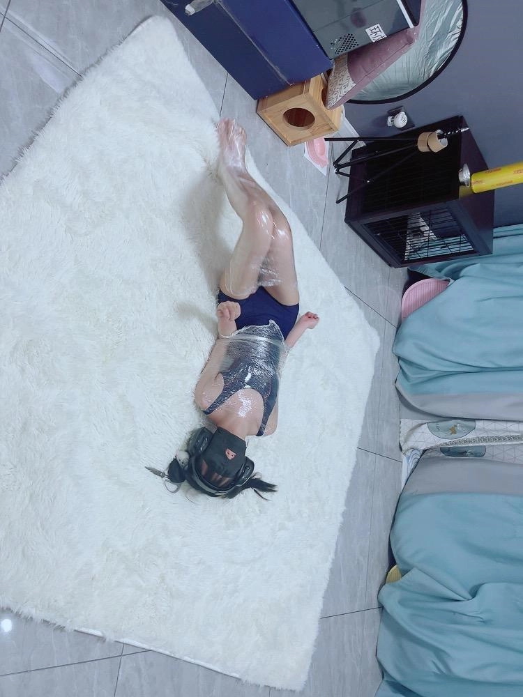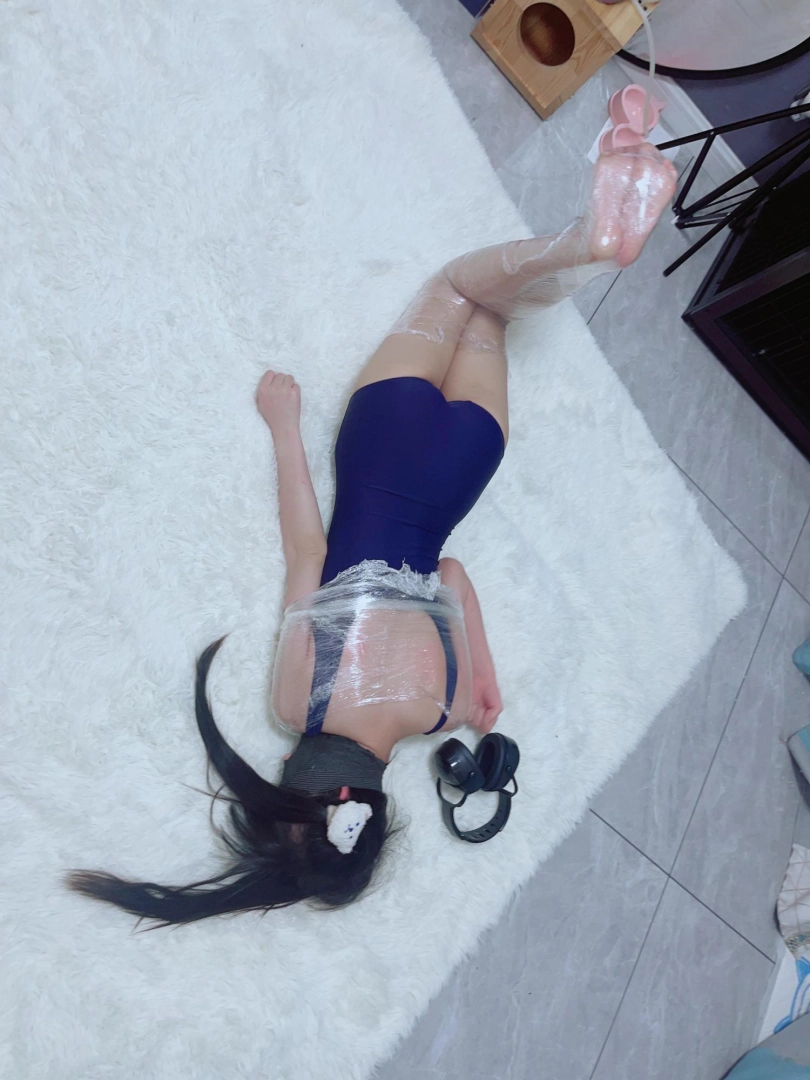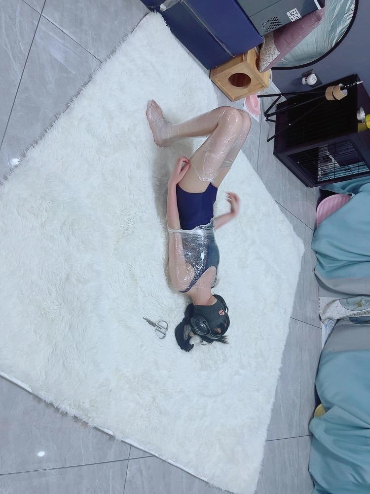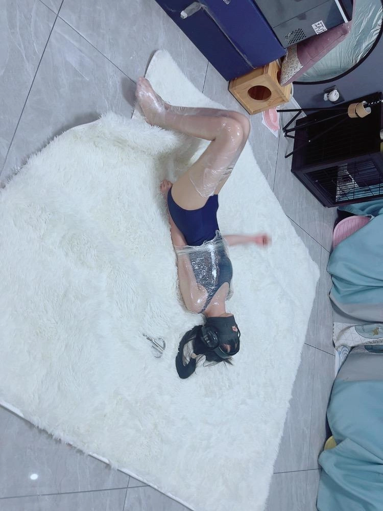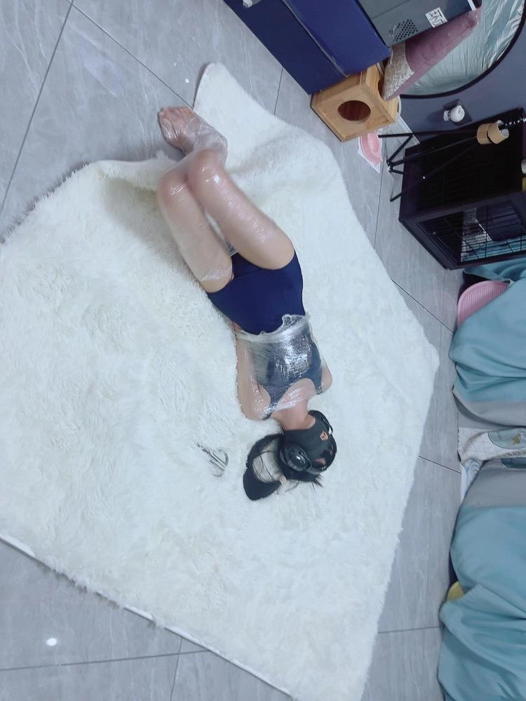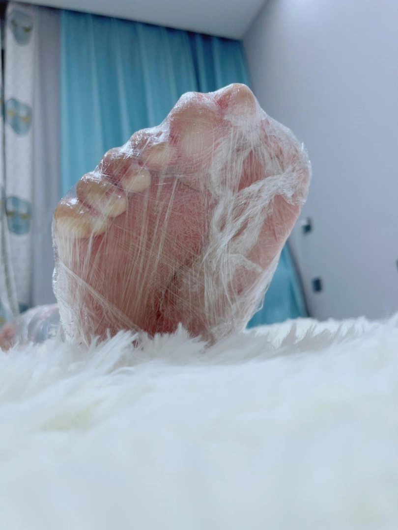 保鲜膜全包别有一番风味:完全透明的保鲜膜包裹着茶茶的身体,白皙的腿和粉嫩的脚底若隐若现,展示感拉满~可以透过保鲜膜完全看到茶茶在内部挣扎的状态,足控也能欣赏脚趾动弹的可爱样子。