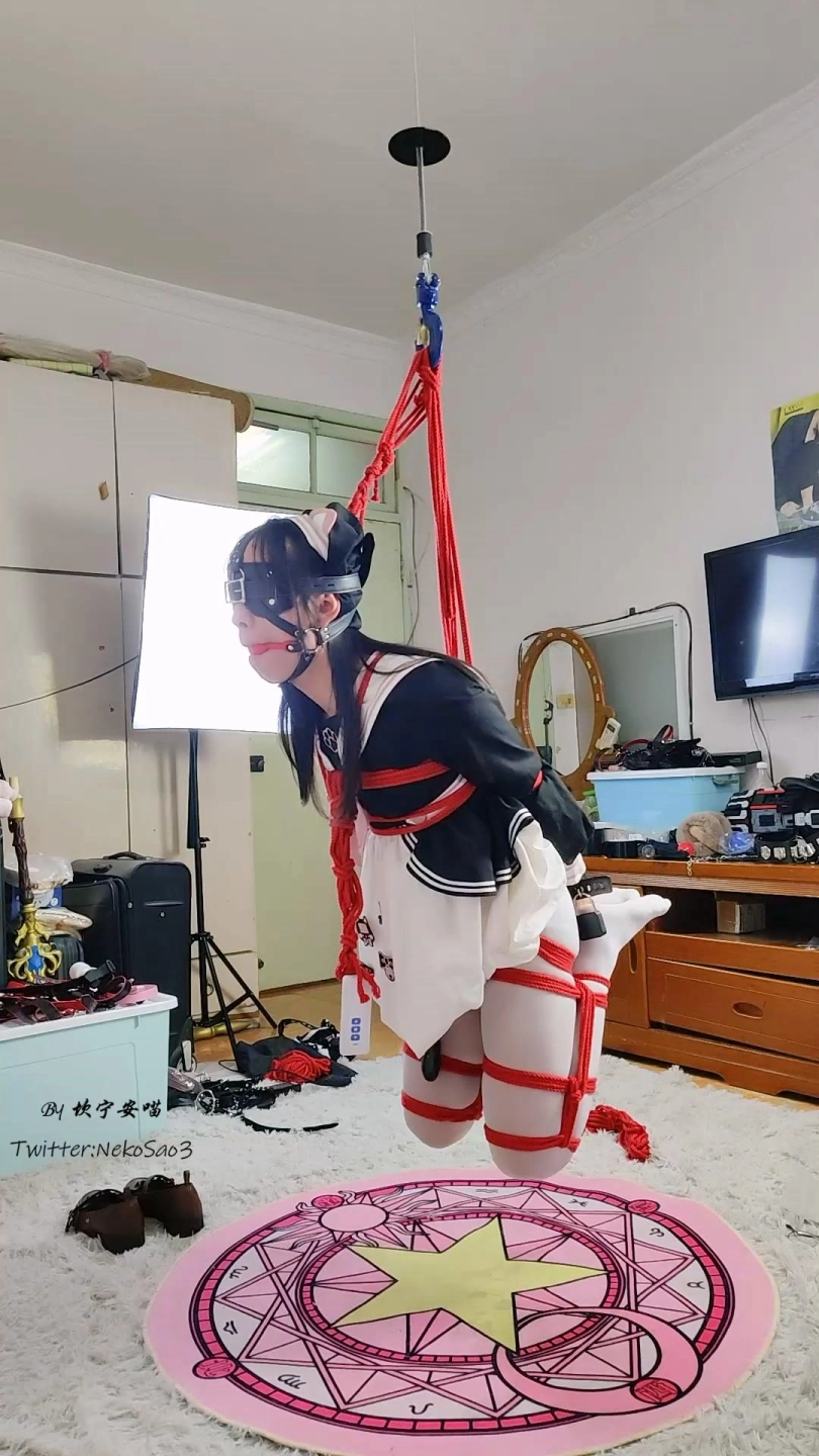 继续自缚~依旧是熟悉的胯吊+上身吊+后手直臂,腿部选用了折腿,然后用绳子拉住马具口球强迫抬头,服装换成了lolita+白丝裤袜