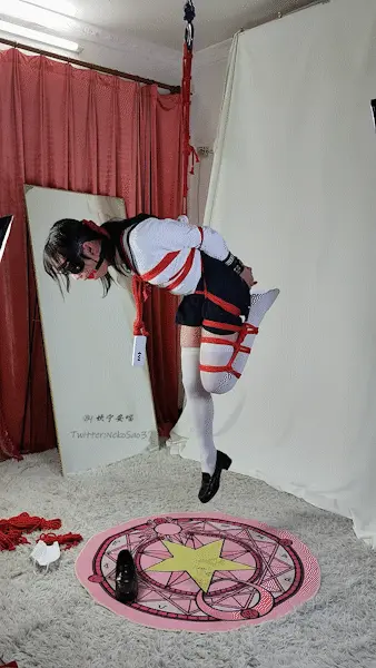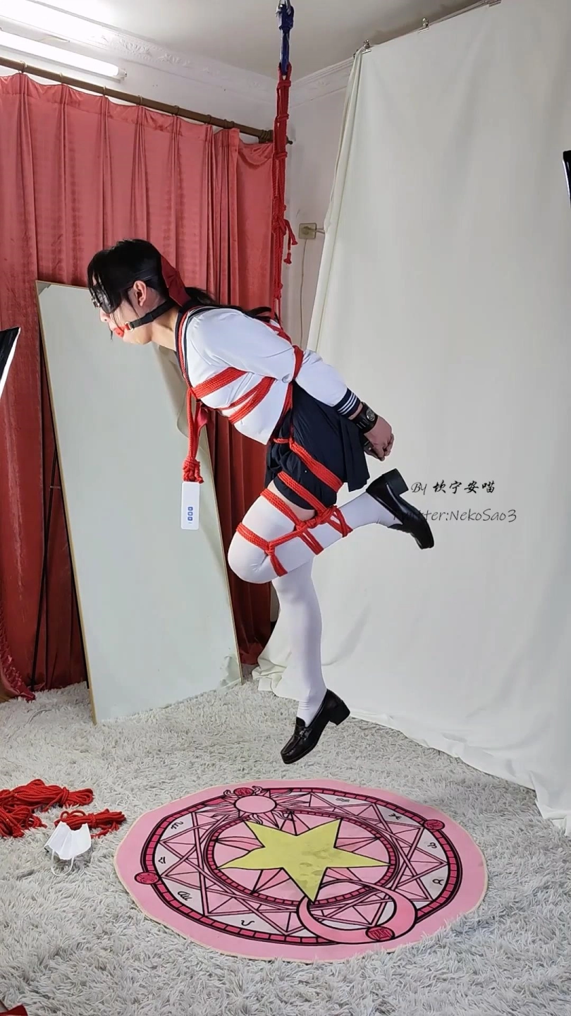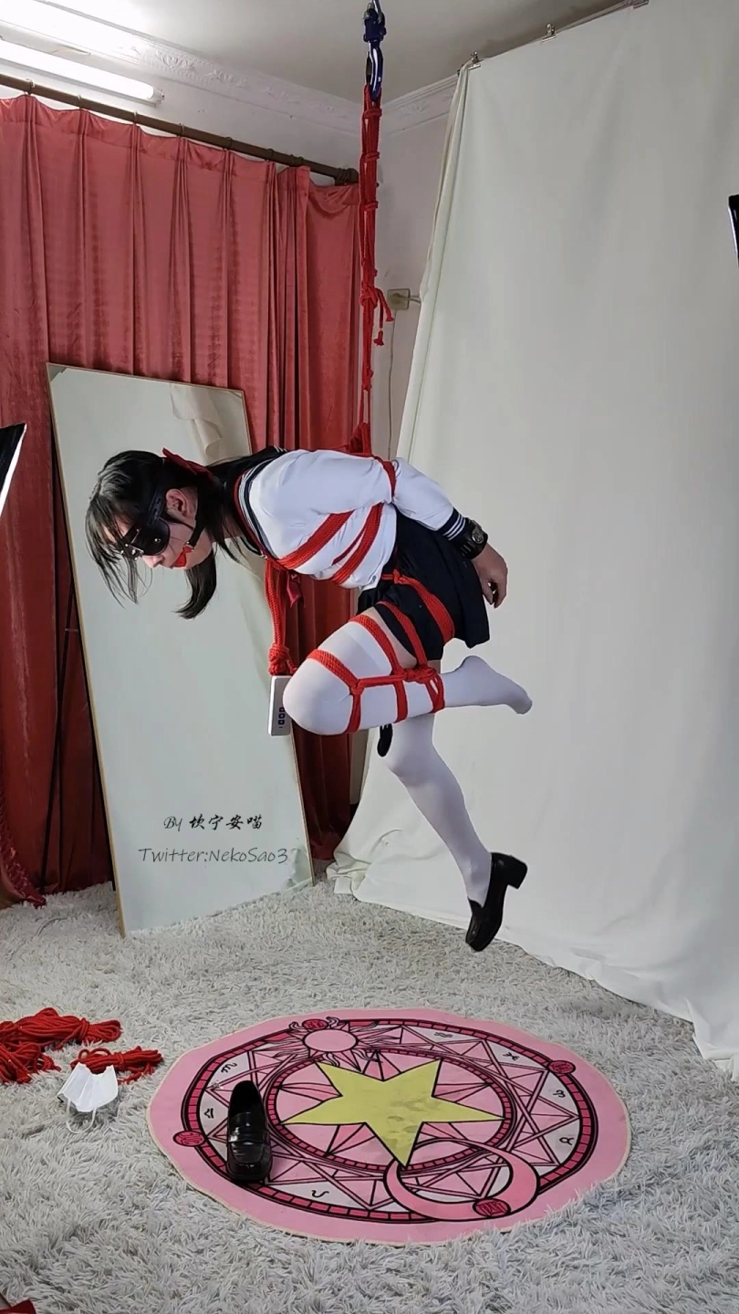 服装是水手服+过膝白丝,捆法是上身后手直臂+胯绳受力+一条腿折腿然后用电葫芦悬吊,道具还是经典的眼罩口枷训练器三件套~