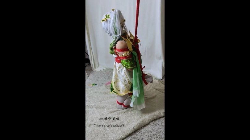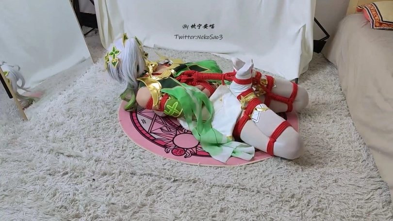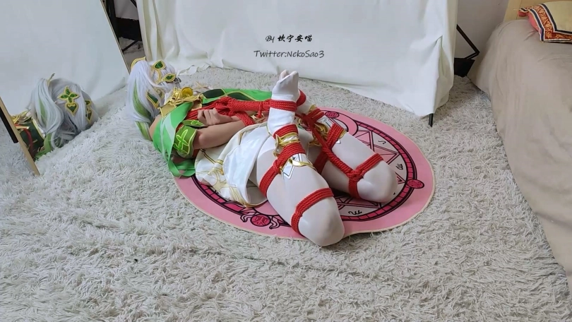 被抓获的纳西妲被以日式+折腿驷马的姿态捆了起来扔到了小房间里,小草神迷迷糊糊的醒来却发现自己被捆得严严实实,用尽全力的挣扎也只是徒劳无功徒费力气……后来她听到了有人进门的声音,但来者并不是救她,而是将她吊了起来,让她只能够膝盖着地,小草神只能继续在无尽的黑暗与无助中扭动着自己不受控制的身体……