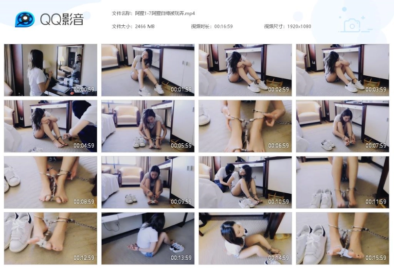 关键词:阿狸 家中自缚 拴住 遇坏人被玩弄 走不了 手铐 脚铐 拇指铐 脚趾铐 休闲装 小白鞋 团缚