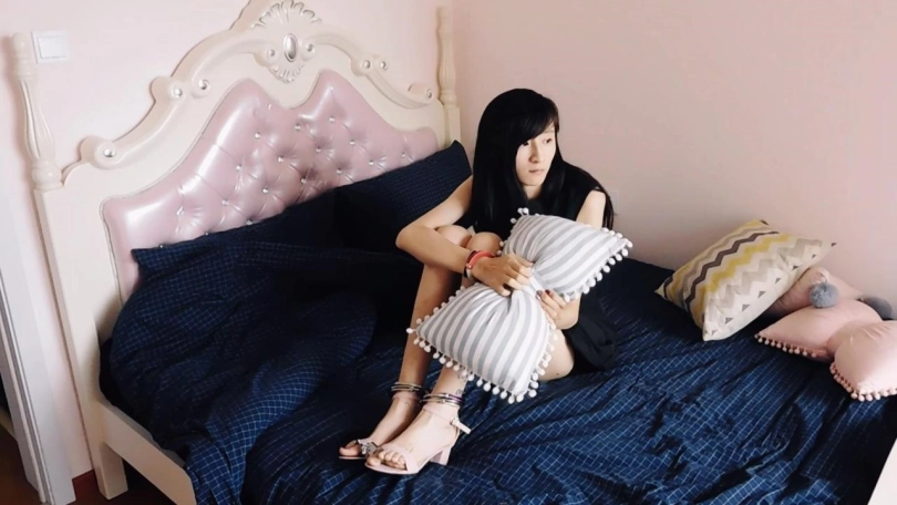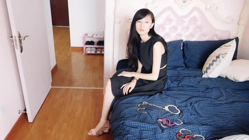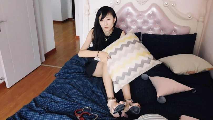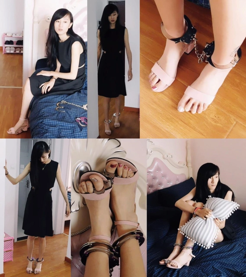 妹子穿着高跟鞋回家,先戴着脚镣,展示、行走。妹子再戴上脚铐、链子脚趾铐,展示、行走。妹子带上手铐,展示。