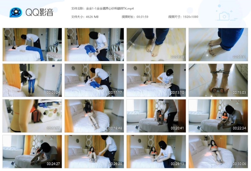 妹子诊所看病,医生开了药,妹子吃下。隔了一会,就感觉不对,然后就睡过去了。这时医生原形毕露,有妹子可以玩了。医生脱下妹子鞋袜,锁上链子脚趾铐、脚铐,然后离开,等她醒来。妹子醒了,然后发现脚被锁住了,很着急,各种喊叫,找钥匙,下地走。医生再次出现,妹子受到惊吓,求饶。医生解下镣铐,脱下衣服只剩内衣,给妹子脚腕锁上链铐、板铐、脚趾铐,然后离开。妹子发现脚被锁的更紧了,十分着急,各种喊叫,下地走,求饶。这时医生又回来了,解开板铐锁在手上,锁上拇指铐,拿出三筒把脚腕脚趾连起来,挠脚心玩耍,然后又塞上蛋蛋。最后留下妹子挣扎,等待命运。