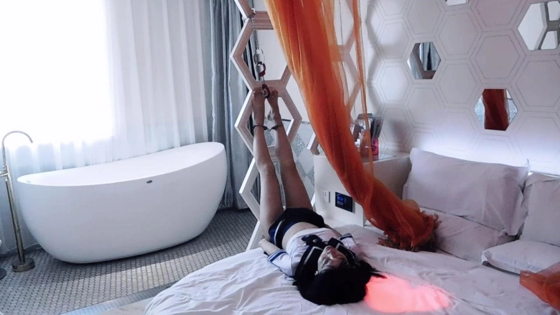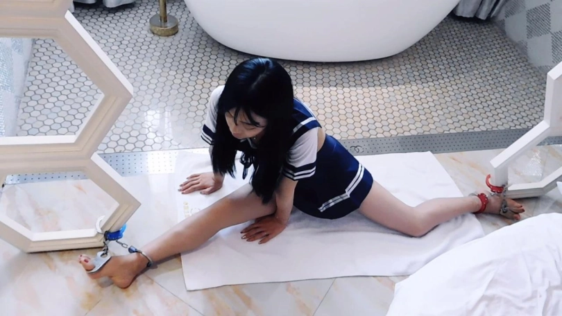 妹子第二天继续来上舞蹈课,这次穿了舞蹈鞋,一进门就被老师认出来是昨天很不用心那位学生。老师说这节课临时改了,不穿舞蹈鞋,让妹子在门口把舞蹈鞋脱掉光脚上课妹子开始紧张,想蒙混过关不想擦掉趾甲油的事要曝光了,妹子害怕地脱掉鞋袜站在地上。老师指着脚趾问为什么不擦掉,妹子又不敢说,只能挨罚。于是老师决定进行惩罚,让妹子躺在床上,脚趾脚腕铐上,吊起来。妹子在吊脚趾的过程中非常难受,一直和老师重复再也不敢了。老师用小皮鞭打脚几下,然后解开了脚铐、脚趾,并开始了上课,首先结练习一字马。妹子的脚又绷不直,叫疼。老师感觉妹子做的很不用心,于是给她分别戴上脚趾铐和脚铐,强制一字马。妹子坚持不住,向老师求情。老师决定来点难度,挠脚心,妹子很难受,一直向老师求情。老师又用小皮鞭打脚几下。老师觉得可以了,解开脚趾铐和脚铐,下一步练习跪下腰抓脚。妹子坚持了一会就坚持不住了,向老师求情。老师让妹子改练习鸭子坐。妹子又做不好。老师又生气了,把妹子的手和脚铐起来,强制坚持。老师让妹子坚持一会。老师觉得时间差不多了,就下课了,解开所有的镣铐。让妹子穿好了舞蹈鞋,离开。