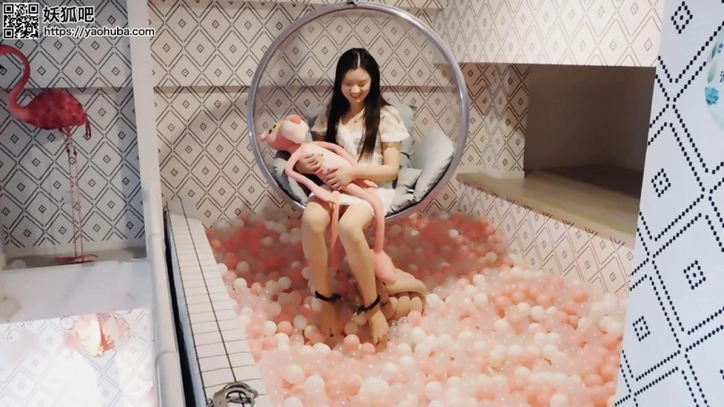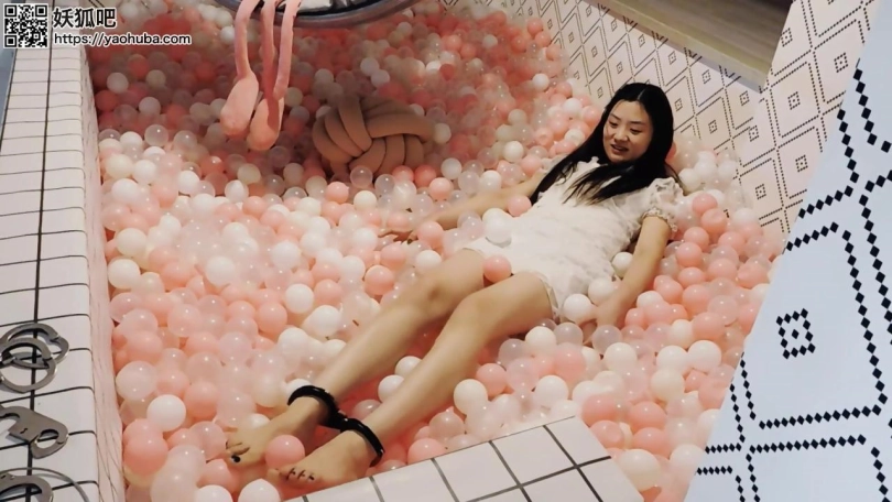 妹子回到家,戴上脚镣走上楼,玩海洋球,再戴上脚铐、脚趾铐、手铐。当她想解开的时候发现没有钥匙,朋友忘了给他钥匙。朋友来给送钥匙,正好撞上妹子在玩,于是绑成驷马,挠脚心玩耍。