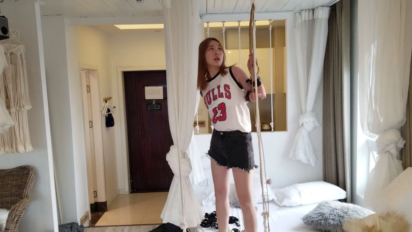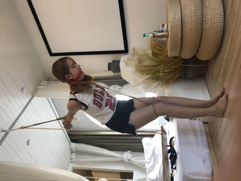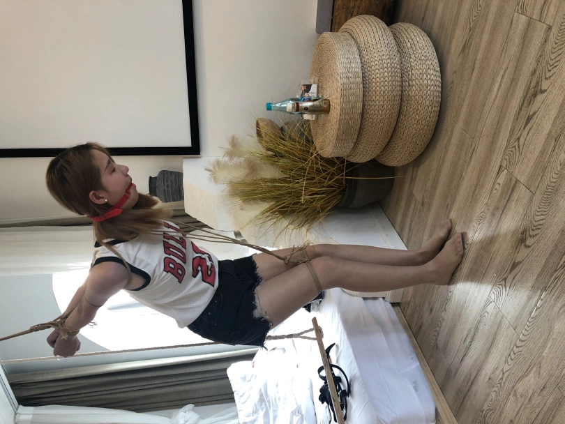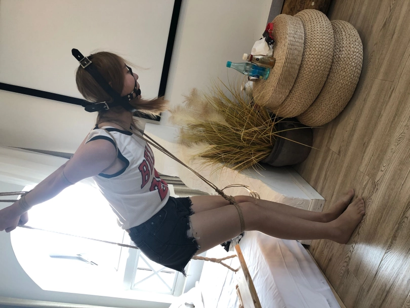 4,将挑战者双手直臂縛于身后。吊起,使挑战者弯腰。用绳子捆绑模特膝盖上放,用另外一根绳子连接膝盖和脖子,使挑战者低头。挑战内容:挑战者将带上3款不同的口球。在被縛情况下,忍住口水,每款口球,忍耐时间5分钟,一共15分钟