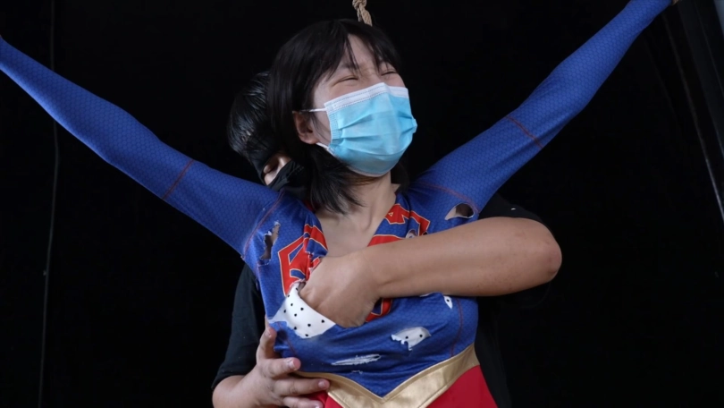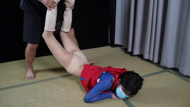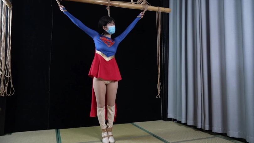 又是一番玩弄后,把女超人倒吊在了竹竿下,离场!