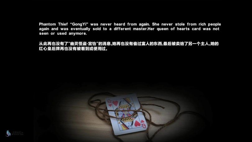 屏幕上出现了这样的文字:“幽灵怪盗-红桃Q再也没有音讯。她再也没有从富人那里偷东西,最终被卖给了另一个富豪。她的红心王后卡再也没有人看到或使用过”。