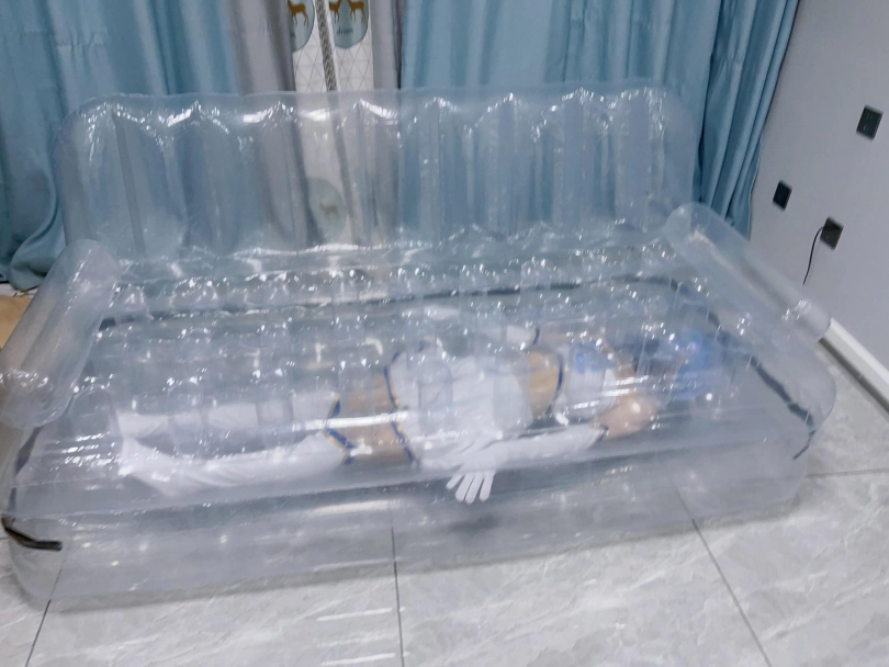 充气沙发没有换气孔,只能类似真空袋一样,呼吸残余的空气,控制氧气呼吸,十分闷热~