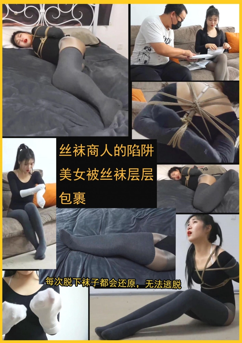 超经典的丝袜推销员剧情,美女低价买了一些袜子,却发现袜子越收越紧,想用手去脱袜子,结果手部也被袜子包裹了,脚上也穿了2层袜子,无法用手指和脚掌的美女发现什么都做不了,美女想脱下袜子,结果手臂也被厚袜子包裹了,甚至美丽的双腿被完全包裹进了一条袜子里。最诡异的是每次美女就要成功脱下袜子时,袜子的包裹都会还原,根本无法逃脱这恐怖的袜子包裹~