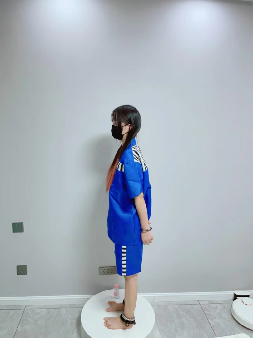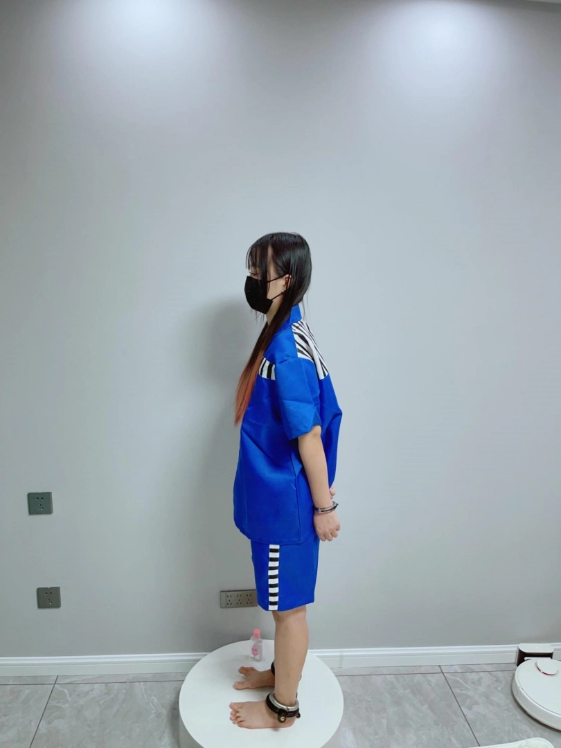 然后命令女囚糖糖保持裸足,让糖糖光脚的情况下在戴着两幅重型脚镣、双手反铐的情况下执行罚跪、罚站、拍入狱照(正面侧面背面)、裸足带镣行走。
