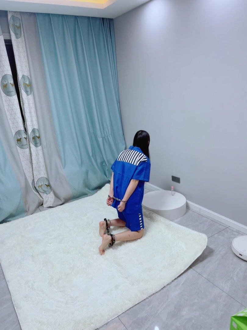 首先给糖糖戴上最严厉的板铐,反铐在身后,然后给糖糖戴上女死囚级别的重型脚镣(10斤),期间糖糖略有不满,作为惩罚又加了一副重镣!