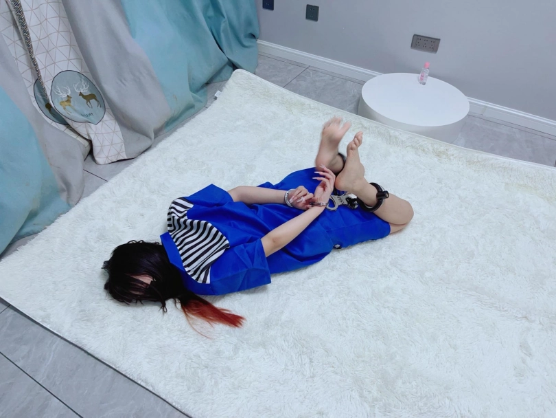 最后用一个筒铐连接手脚的镣铐,让糖糖以女死囚的身份驷马在地板上过夜。
