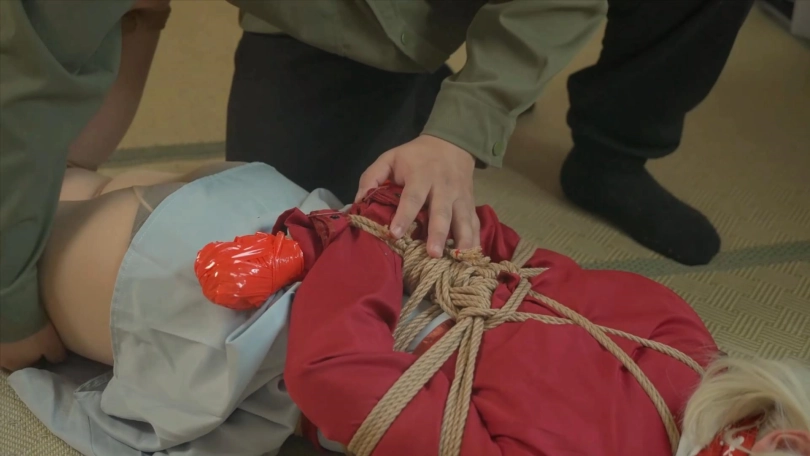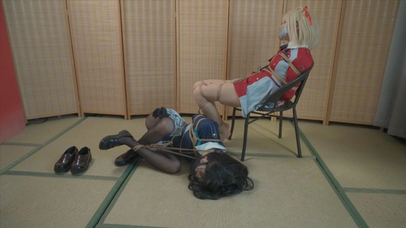 但是被人从身后击晕,随后歹徒把两人分别海老缚+驷马捆绑起来