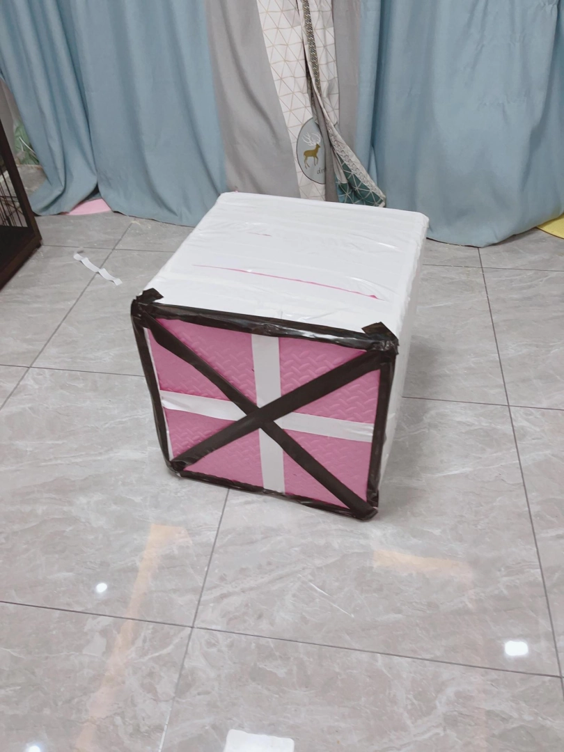 当然,牢固上也不能放过:在箱子内侧每条接缝处用布基胶带封好加固、然后在箱体外侧的4个面用布基胶带仔细包裹每一个角落,头顶的盖子在茶茶进入后用布基胶带多道加固,先X型贴胶带加固,然后横竖多道分别加固,保证牢固。
