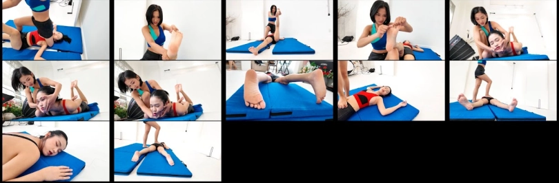 2 rookie girls Venus (Red top) and Elisa fight each other in a wrestling match with various wrestling moves like sleeper hold, camel clutch, head scissors...
