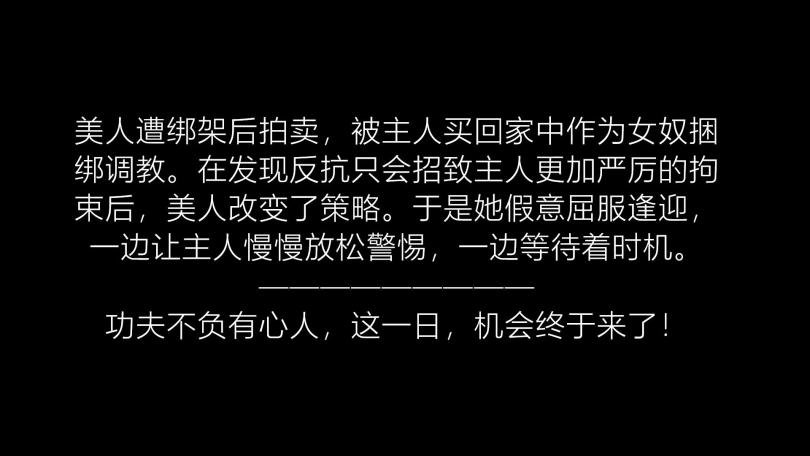 美人(柳洋饰)被人贩组织绑架后拍卖,被新主人买下后带回家中,作为女奴遭到主人的严厉捆绑调教。女奴假意屈服希望使主人松懈,由此寻求机会逃脱。