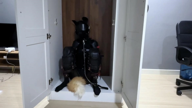 比上次更完整的K9深入训练 一开始小鱼穿好连体衣带上了狗狗面具 K9套装 塞上小狗尾巴 怕太久没变小狗生疏了 先练习爬行一会