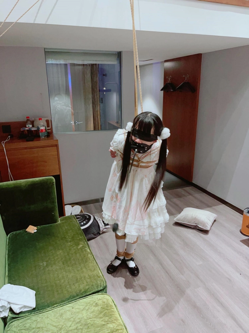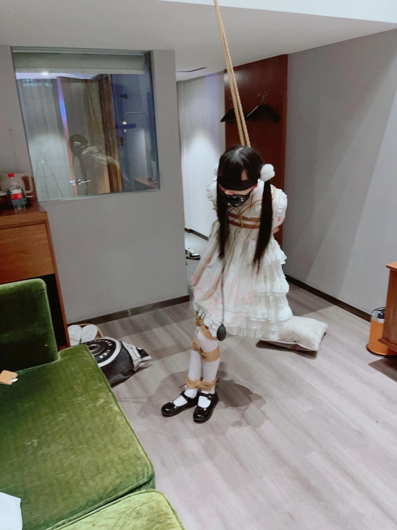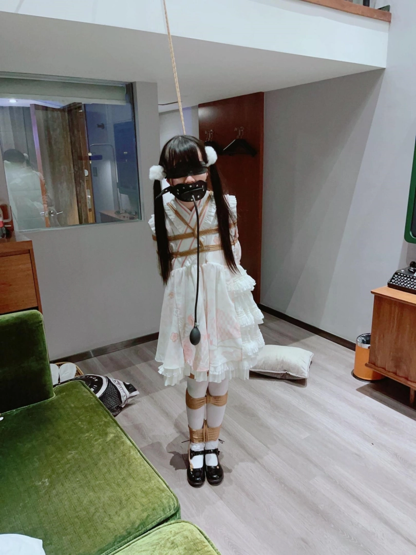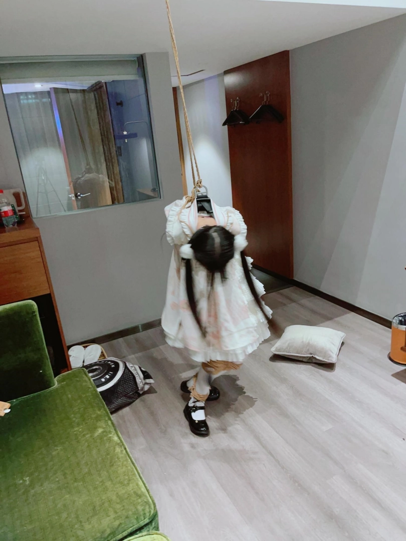 3.就这么折磨了一小时左右,茶茶突然崩溃大哭,拼命挣扎,不考虑任何重心,为了安全考虑我只能剪断了绳子,暂停拍摄。但是体力压榨不会这么轻松结束,我劝了茶茶几分钟,然后把茶茶双手举高,继续吊缚,双手举高罚站了十几分钟,直到茶茶完全疲劳绝望才放开茶茶。