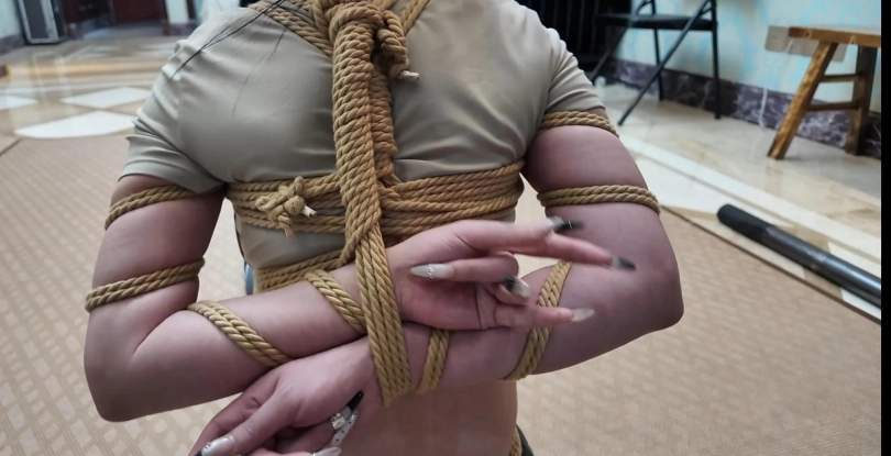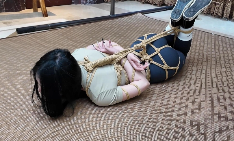一小偷用万能钥匙入户盗窃,不料女主人突然回家,小偷做了一番思想工作后,决定埋伏起来,一不做二不休将女主人捆绑起来,劫财劫色,刚进屋的女主人哪里知道危险正在向她靠近,一进屋就被挟持,用刀威逼,接着被小偷反剪双手,押解着去家里寻找绳子,用自己家的绳子把自己五花大绑成大闸蟹一般,押着女主人找到绳子并命令她下跪,接下来到了小偷的表演时间,将女主人上半身五花大绑(这里强调要勒胸口),五花大绑让女主人本就丰满的胸脯更大起来,看着就让人想入非非,下半身捆上股绳(股绳的作用把臀部勒得非常丰满),双腿脚则被捆绑了四道,大腿根部,膝盖上下及脚腕。捆绑结实以后,小偷让女主挣扎,女主只能扭动绳子进行挣扎,可这都是徒劳的,一个被绑成大闸蟹般的弱女子怎么能挣脱开束缚呢?接着小偷用一块厚毛巾塞入女主口中,接着用5张布基胶带黏住嘴巴,女主这些只能发出呜呜呜的声音了。捆绑堵嘴完毕,小偷还不放心,用一根长绳子把女主驷马倒攒蹄捆绑,再拉紧绳子让女主上半身翘起来,被驷马倒攒蹄的女主只能在地上呜呜呜呜并蠕动身体,见女主被如此捆绑后,小偷才放心去房子搜索值钱的物品。客厅里的女主见小偷进房间后,挣扎着,蠕动着往门口爬去,这对她来说很难,驷马倒攒蹄让女主的没移动一厘米都发出呜呜呜呜的声音,女主努力着快移动到门口时,小偷找到了银行卡从房间出来,看到将要跑到门口的女主后恼羞成怒,把她拖回了客厅中央,然后用刀威胁她并逼迫她说出银行卡密码,女主为保命只得老老实实说出密码,问询到密码的小偷并不像离开说到:既然你想逃跑那就惩罚惩罚你,哈哈。