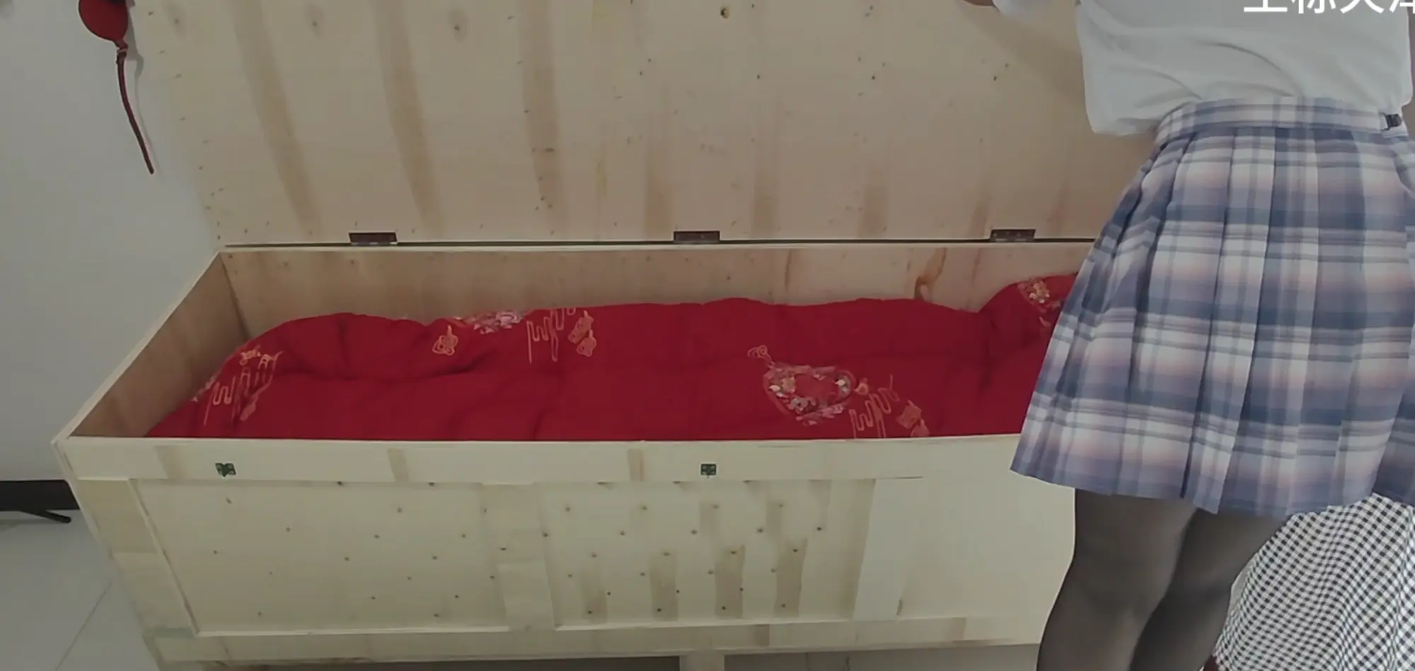粉丝来体验棉被全包,结果被CC学姐和学弟勒索~[X_X]逼问银行卡密码。粉丝连续3次说出了错误的密码~让学弟白跑了好几次,结果生气的学弟要求学姐,一直关在箱子里边,不行出来!当学姐永远的床~里边超级舒服~学姐很喜欢新的床~最后说出了最后的密码~但是学姐怎么可能放过他,直接封箱,准备晚上扔到海里边~