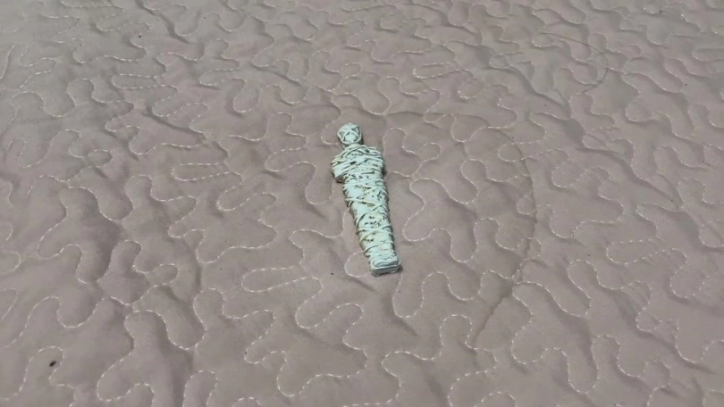 最后吴晗全身都被绷带包裹了。从脚到脖子全部包裹了。头上也加上了头头饰。吴晗更加惊慌了,她这时发现自己被捆绑的姿势和纪念品一模一样,这是才确定真的被纪念品诅咒了。一阵后悔早知道就不弄金字塔里的文物了。