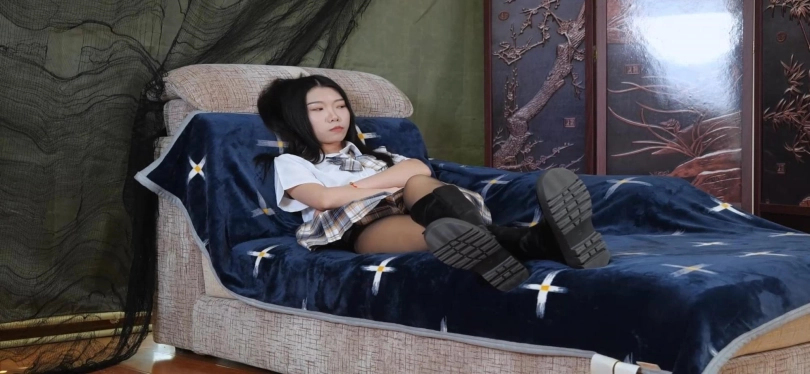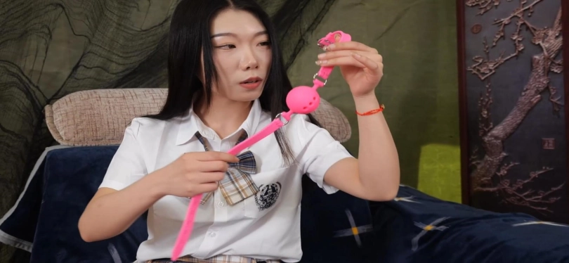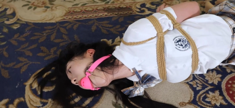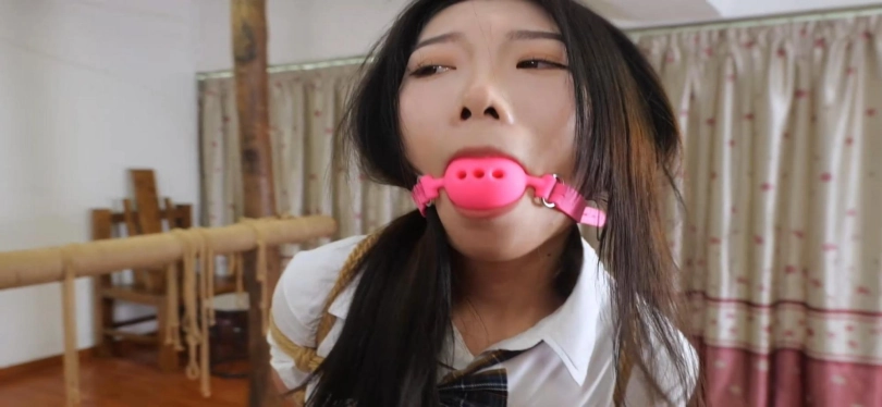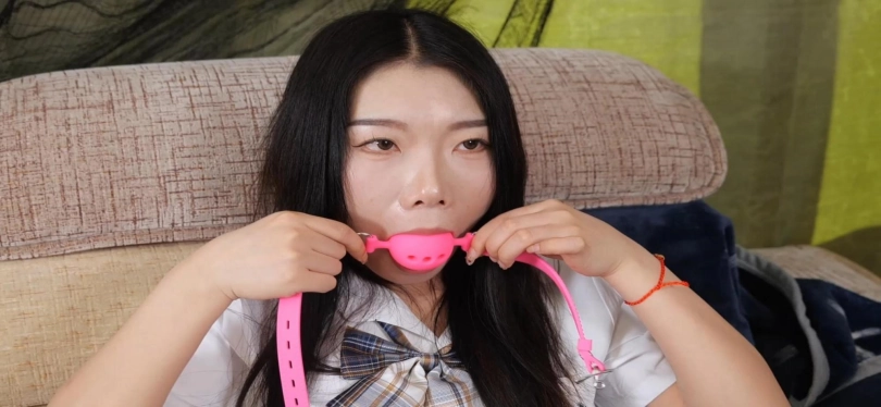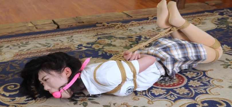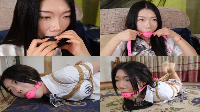温婉这天下班到家喝了几口水,然后坐到床上,很无聊,无意间看见一张模特被绑了的图片,产生了兴趣,脱掉靴子,脱掉套在光腿神器外的黑丝,七七:丝袜等会可以用来堵嘴。心里也起了想法自己也要自缚玩不玩,拿起电话订购说:我要两个大号口球和绳子,过了一分钟,快递到了,便穿好靴子起身去拿,拿完后拆开,温婉:真不错,口球还挺好看,还送了胶带正好等会封嘴用。拿出两个口球仔细看了一下,再次脱掉靴子,到床上,便分别拿起三条绳子按照图片自己复刻把腿绑了起来,绑完后,拿起之前脱掉的黑丝,塞到嘴里,胶带紧紧封上,挣吟起来,过一会拿出嘴里的黑丝,看见盒子里面有个纸条,看着纸条念了出来,温婉:大号的口球,塞嘴里拉到最紧,说不出话,也不可能吐出来,请勿一个人尝试。接着说,肯定是假的,今天我就验证一下。塞嘴里,拉倒最紧,用胶带双手绑上,突然看像前方,嘴里挣吟着:你是谁,救命,接着摇头不要过来,醒来上身被绑上日式,嘴里还是塞着自己戴上的大号口球,拉倒最紧了,根本没办法吐出,腿还是刚刚自己绑上了,疯狂挣扎挣吟,喊救命。自己尝试起身逃跑,起来跳几步,眼前一黑,被绑了超紧驷马,只能疯狂挣扎挣吟。