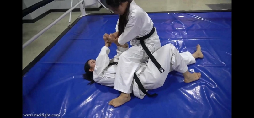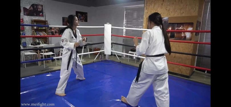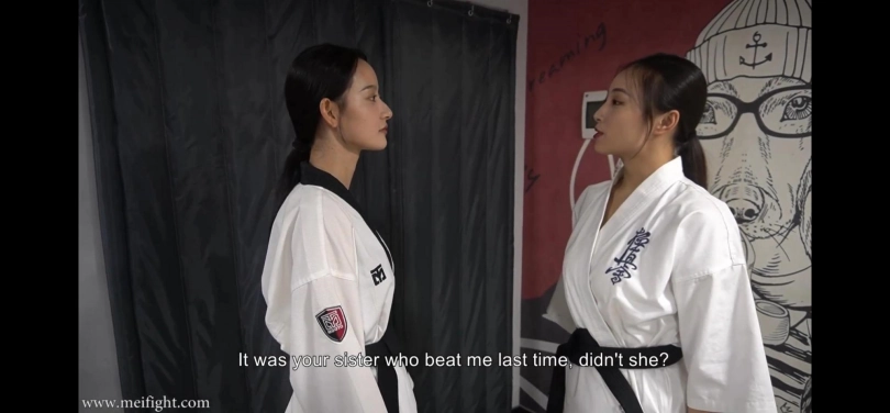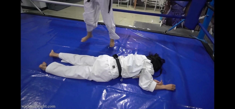 两个跆拳道女孩以为琐事大打出手,互相蹂躏对方,摆出各种羞耻姿势,最终一个女孩被打晕倒在地上。
