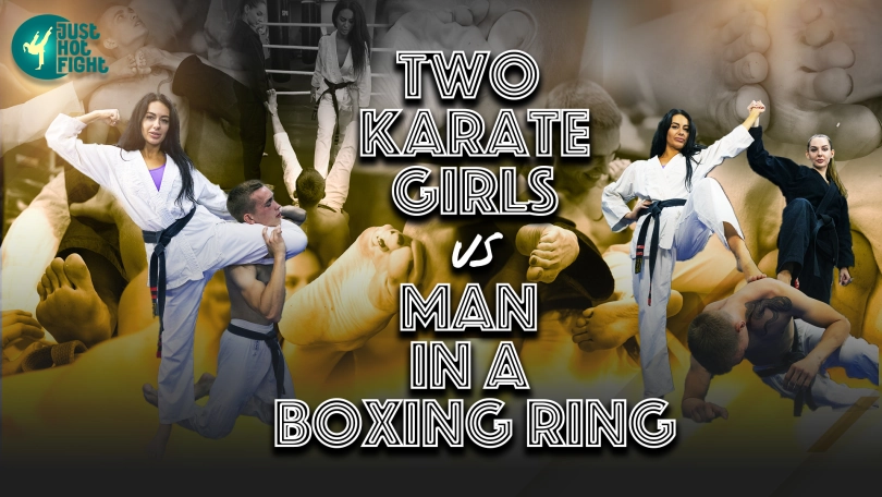 【JustHotFight】TWO KARATE GIRLS VS A MAN IN A BOXING RING