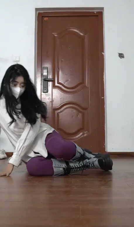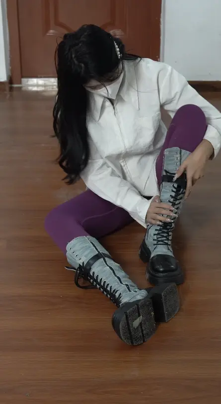 女生回家换上新靴子,走路不慎扭脚, 脱靴子揉脚。