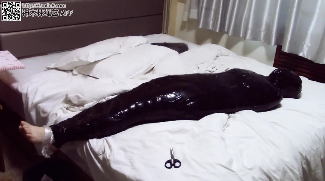 全包:先给妹子戴上口球眼罩,用保鲜膜缠绕之后再用布基胶带加固 把妹子包的严严实实的