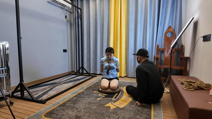 客户到来之前,先把佳佳日式紧缚捆绑,跪在房间等待客户体验,客户来了简单沟通之后,换个后手观音捆绑