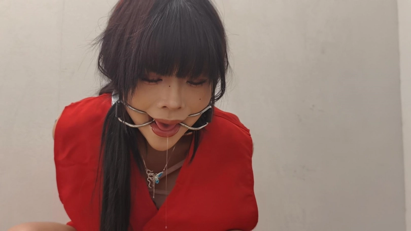 【忘忧社】女犯带手脚连铐颈手铐拇指铐被判死刑,带口环指认现场口水哗哗流,为了惩罚她这样罪大恶极的凶犯,给她后手吊高铐脖子靠墙锁住,疼的女犯直哼哼。