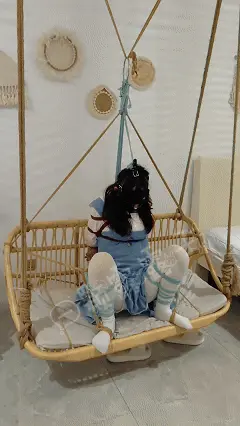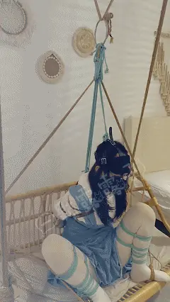 露露白天穿了一天的棉袜被无情塞进嘴里后被马具口塞堵住无法吐出,眼睛被蒙享受坐在吊椅上荡秋千的感觉。