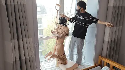 前几天刮风下雨,今天天气突然变好了,于是把露露扒了个精光全裸绑在窗户台子上罚站,日式驷马+折腿吊缚,楼对面能看个精光。小狗口具蒙眼被绑在窗台上玩弄。
