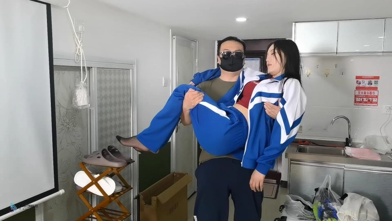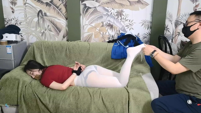 女主在沙发上醒来,起身逃往门口,被尾随者发现后被迷晕(激烈挣扎和呜咽持续10-20秒),随后被公主抱抱起,对着镜头环绕展示后(15秒以上),尾随者将其公主抱进入卧室,放在置床上,脱掉女主的板鞋,露出白袜后给足部特写。尾随者将女主白袜脱下后,露出黑丝,再次给足部特写。后将白袜塞入女主口中(塞入过程全程特写)。随后脱去女主校服长裤和外套,拍摄全身游走镜头(从头到脚的展示+面部特写)。尾随者抚摸女主黑丝腿部,从下到上摸遍全身(固定镜头保证女主全身都入境),随后将女主白衬衫口子解开后脱去白衬衫,露出内穿普通短袖t恤。尾随者离开卧室,拍摄女主躺在床上的全身游走镜头。