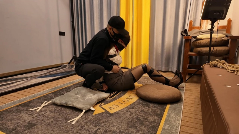 先把佳佳日式紧缚,关到笼子里面,等待客户到来体验,到了之后把佳佳从笼子里面牵出来,由于时间长了,佳佳双手早就麻木了,解开稍微休息了一会,先胶带捆绑,胶带缠绕嘟嘴,由于胶带堵嘴,和缠绕过于显得佳佳胸部很丰满,客户控制不住对佳佳上下其手,摸得佳佳呜呜只叫,胶带缠的太紧,不一会佳佳手就受不了,解开手之后,嘴都没有打开,就瘫软到地上