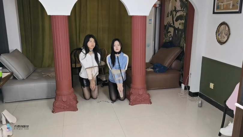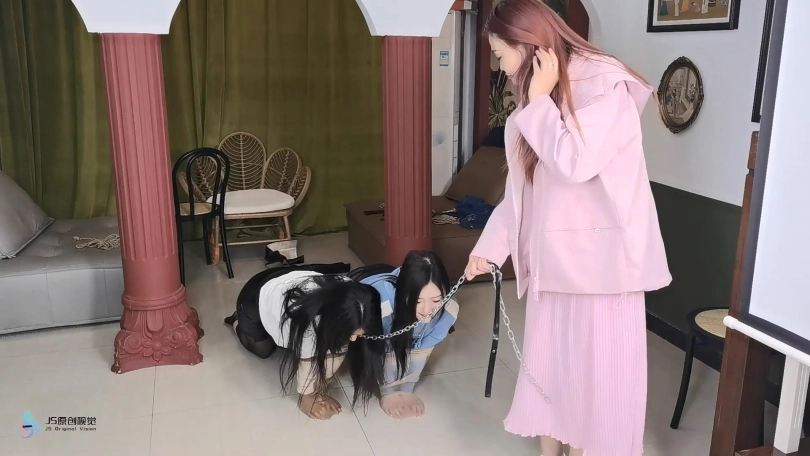 两个女孩堵嘴物被取走,她们双手被丝袜套着,脖子上戴着项圈,双腿被绑在一起,女匪牵着项圈上的链子,带着她们爬进了卧室。。。