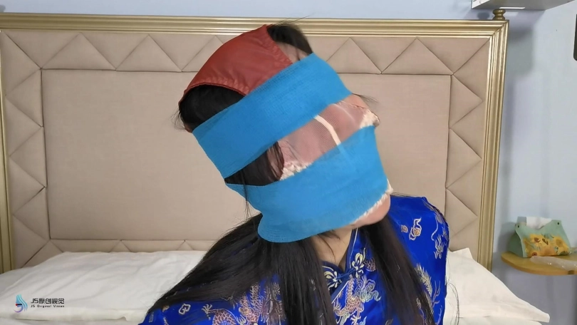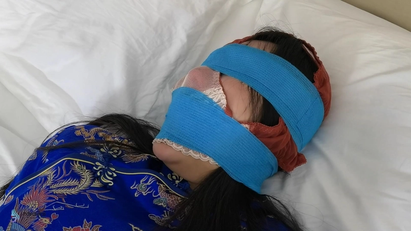 女主双手反捆,双手握拳缠绕胶布,绳捆胸部上下,膝盖。省略过程,画面出现时绑好。