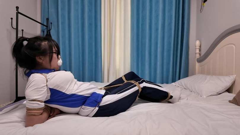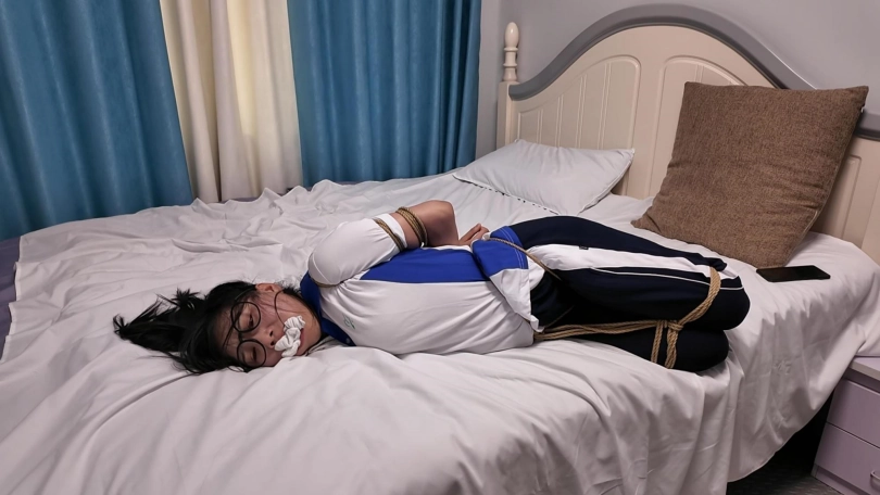 小遥被强制捆绑在床上,拼命挣扎,被白袜子堵嘴,驷马捆绑,最后累的几乎毫无力气,拍小遥是个力气活,她每次都是拼命挣扎,不花大力气根本控制不住她,非常敬业的一位好模特,也是一个资深爱好者