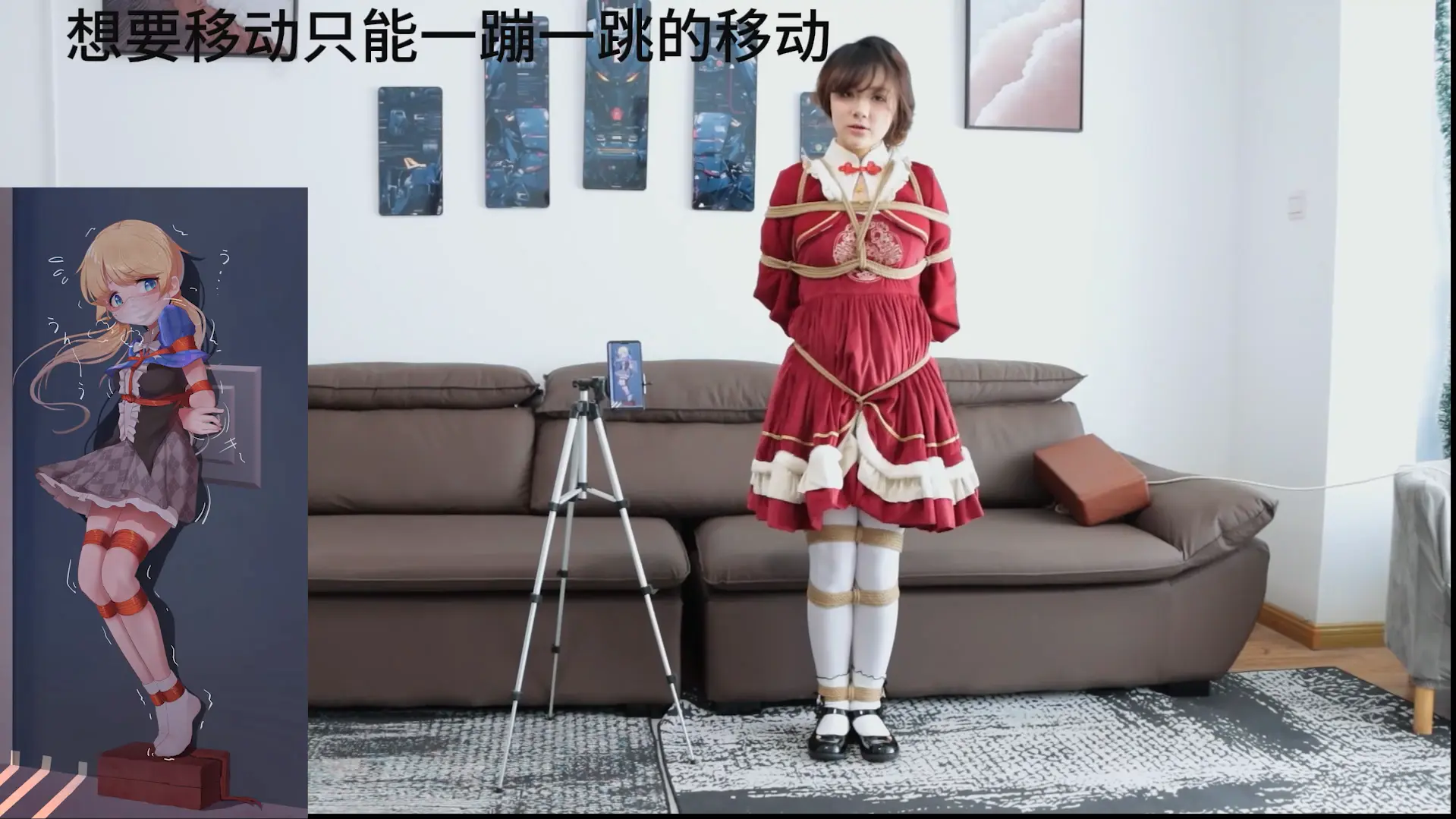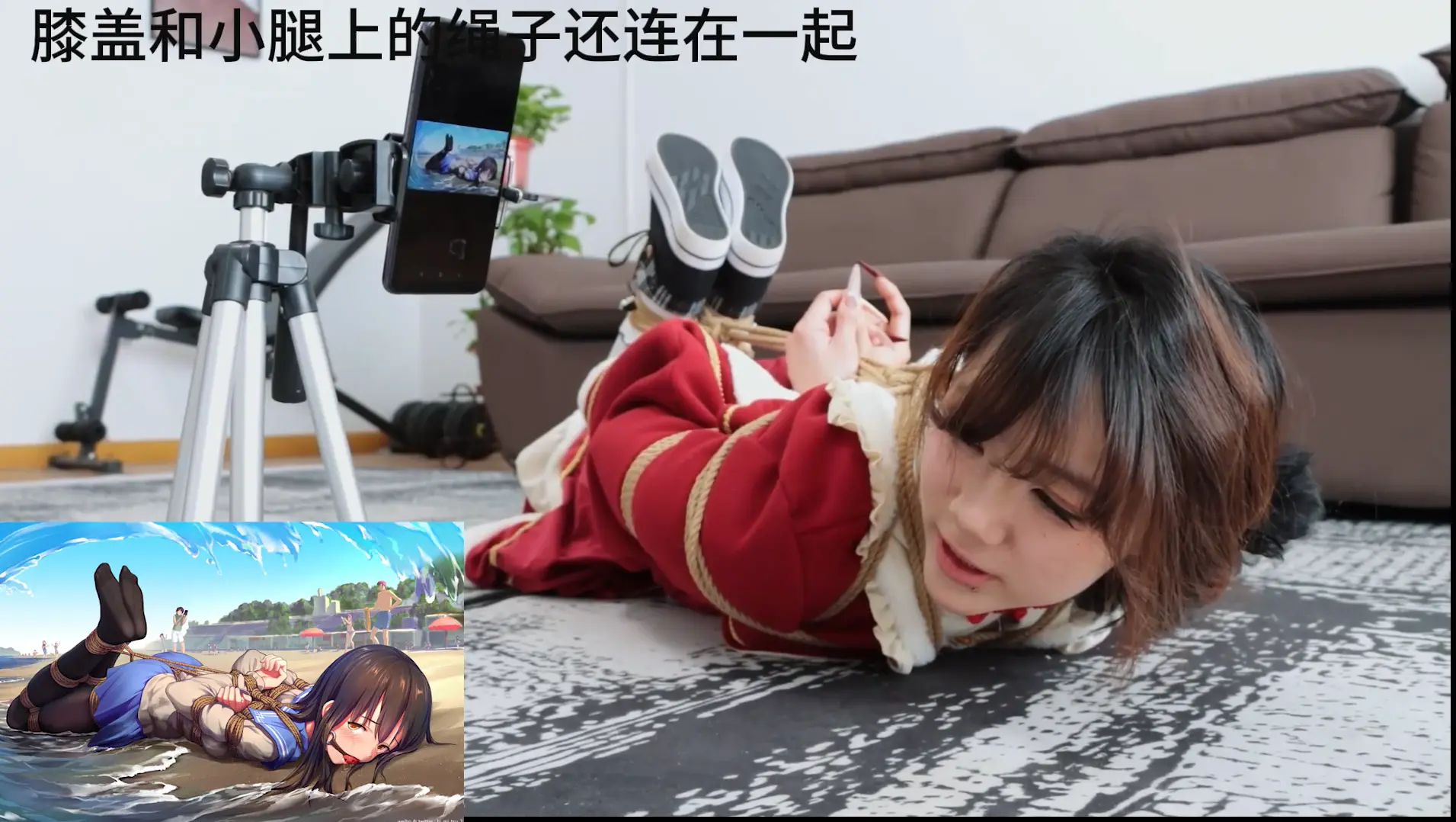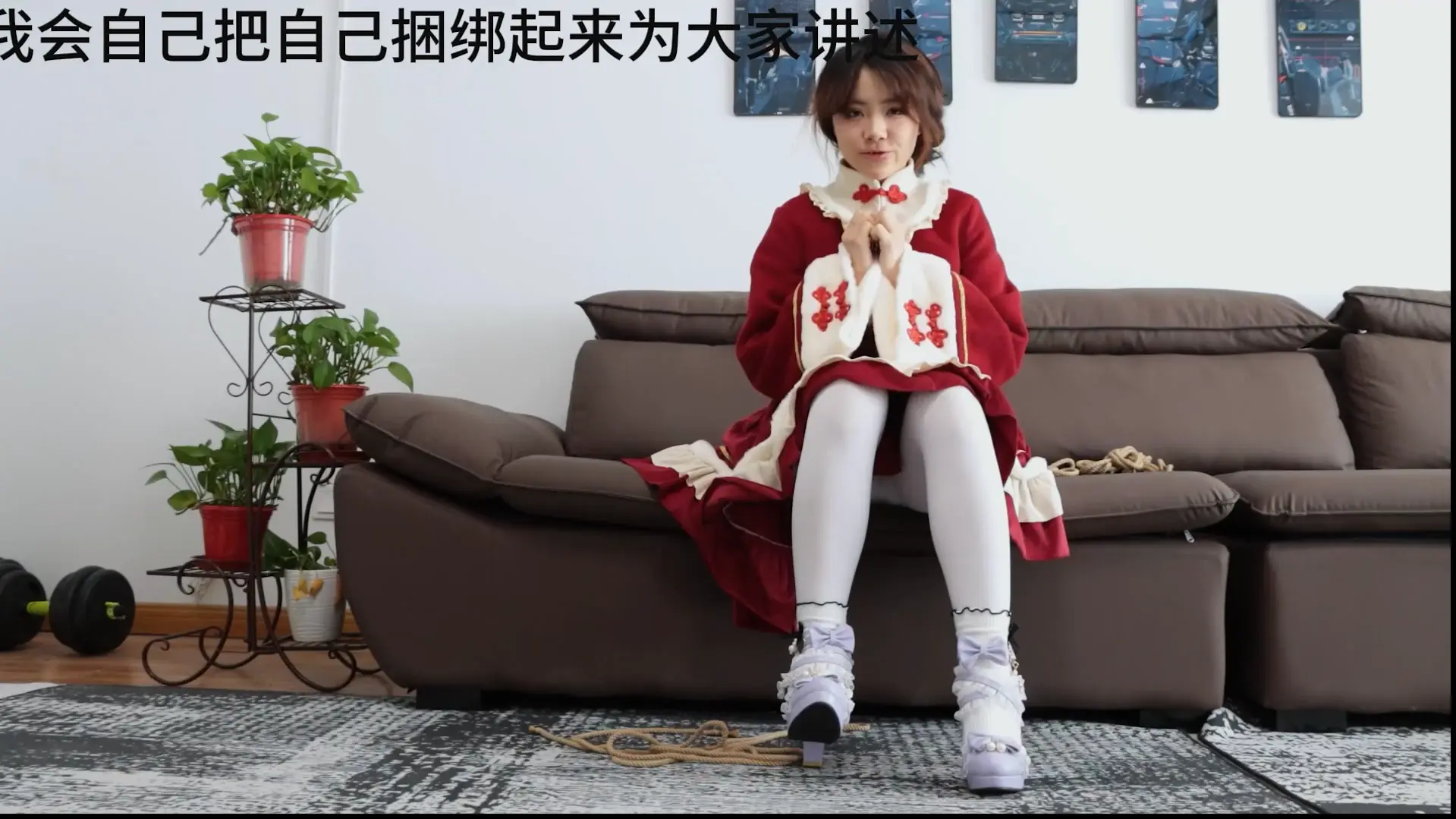 将模特按照图片中的绑法捆绑,并描述绑法,绑好后,准备另外的三张图片,模特需要被绑着描述并演示图片中的内容及动作,包括但不限于服装、绑法、图片故事情节等,共准备两轮。