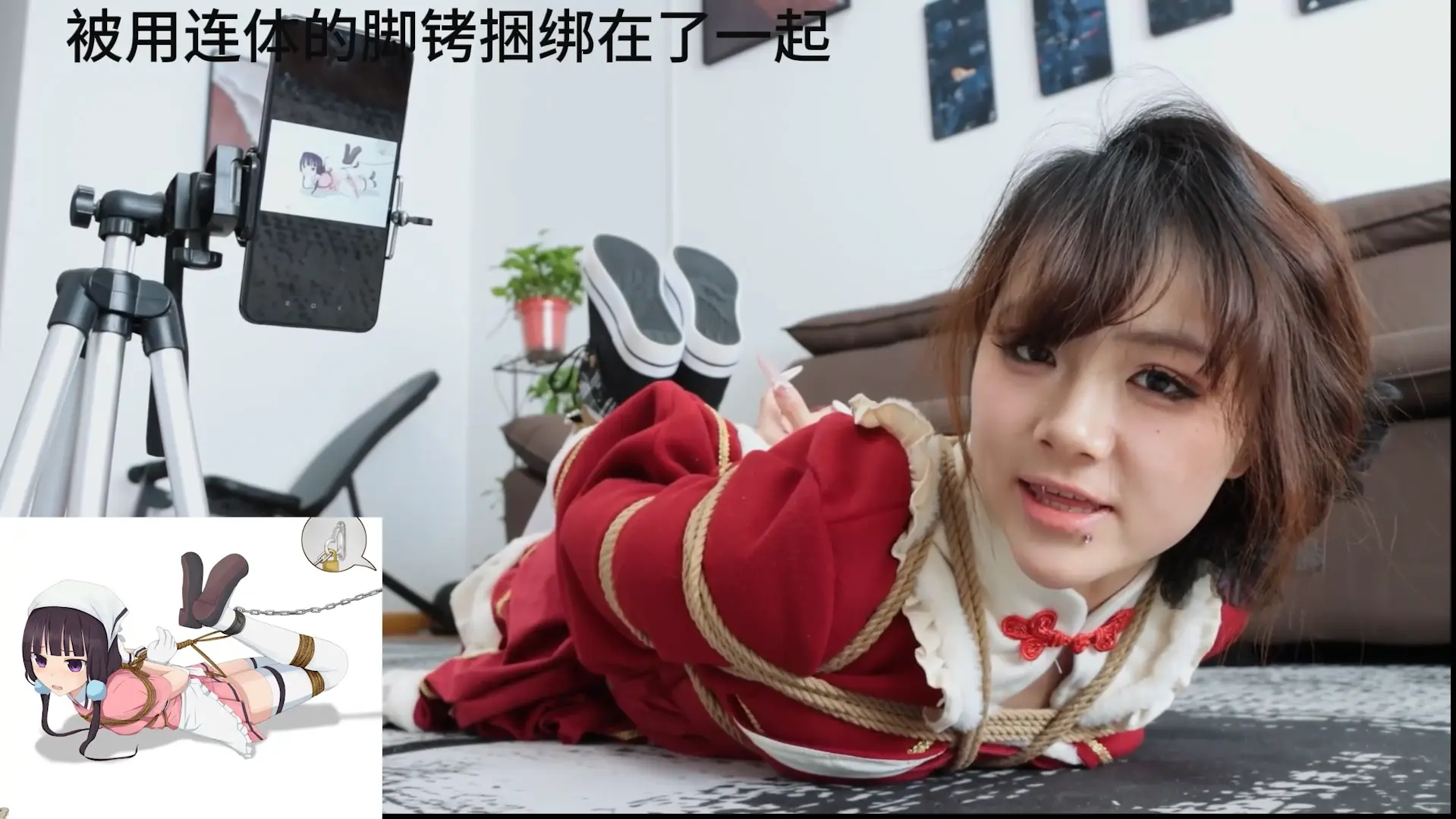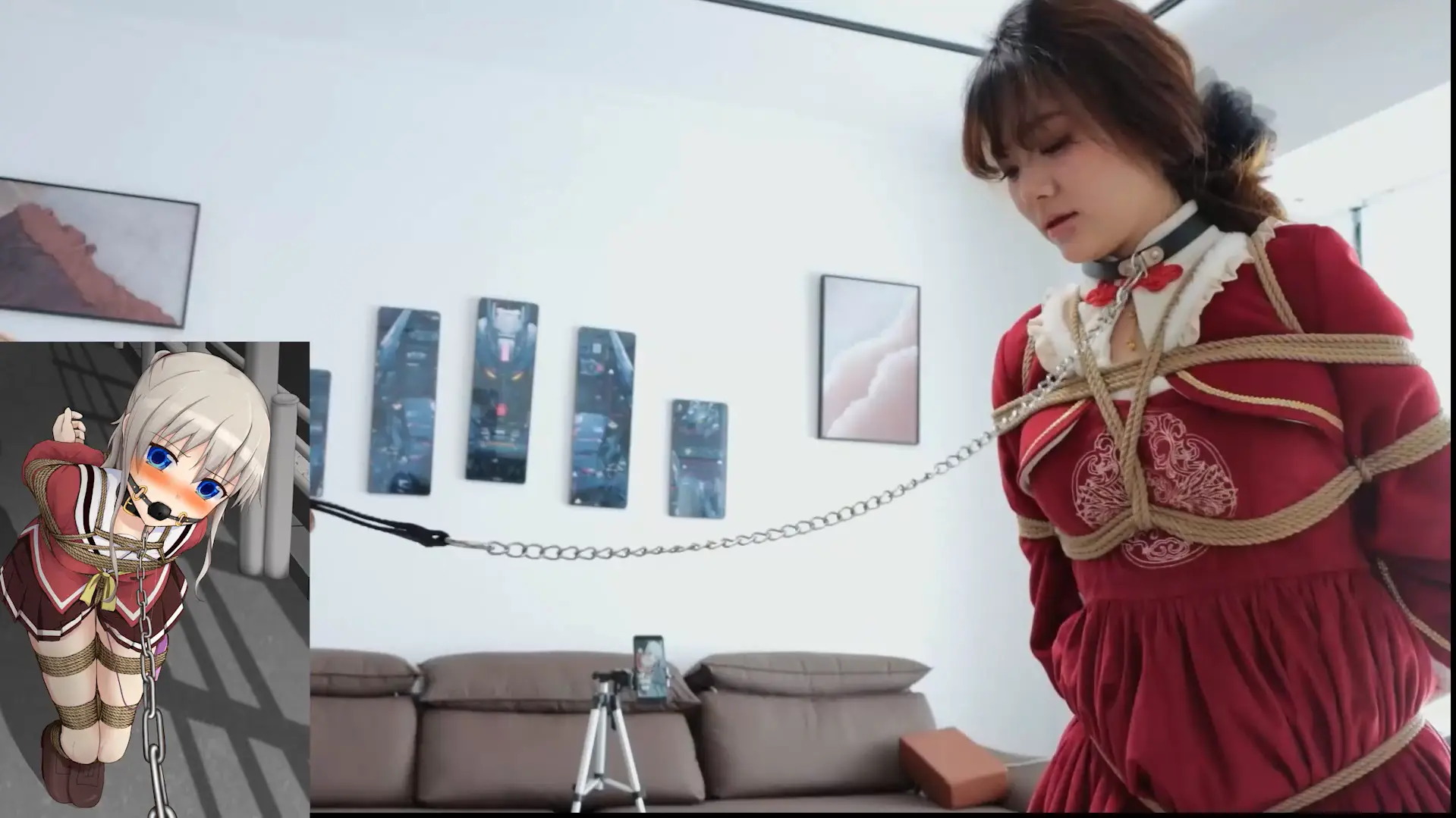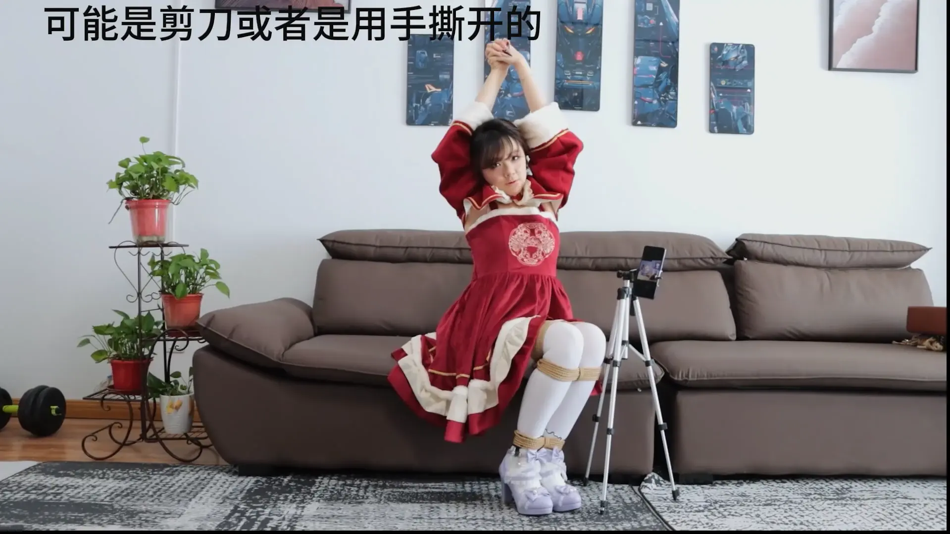 将模特按照图片中的绑法捆绑,并描述绑法,绑好后,准备另外的三张图片,模特需要被绑着描述并演示图片中的内容及动作,包括但不限于服装、绑法、图片故事情节等,共准备两轮。