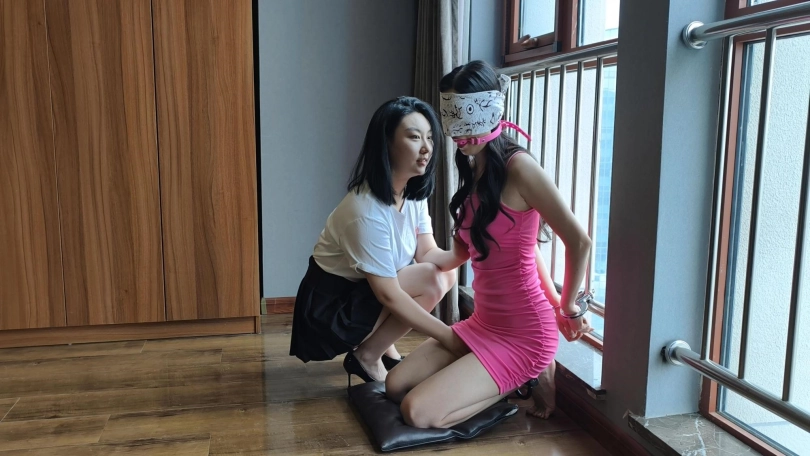 【忘忧社】闺蜜间的游戏-两姐妹在家玩字母游戏,由于表现良好被奖励一起玩镣铐,二人比赛谁先给谁带到不能活动为止,结果带完姐姐把钥匙扔了,妹妹气不过,二人扭打挠痒起来。