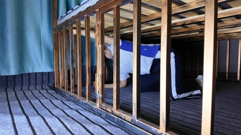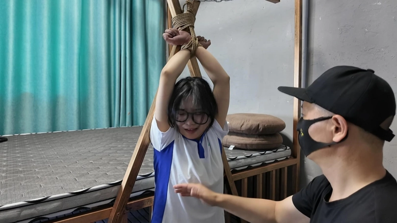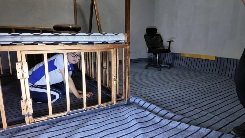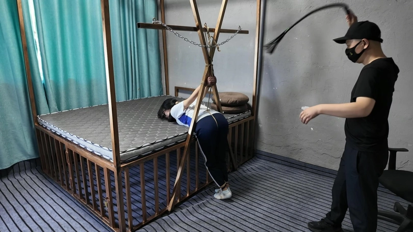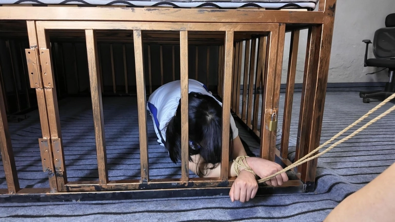 小遥被抓起来之后,关押在床底下的笼子里,劫匪把小遥拉出来,捆绑成驷马,准备卖掉,小遥在房间里面拼命挣扎,好不容易挣脱开,准备逃脱,被刚好进来的劫匪抓住,这下把小遥绑到床上,拿起皮鞭一顿抽打,打的小遥嗷嗷直叫,皮鞭打不过瘾,又打耳光,最后小遥求饶,在也不敢跑了,被关到笼子里等候买主