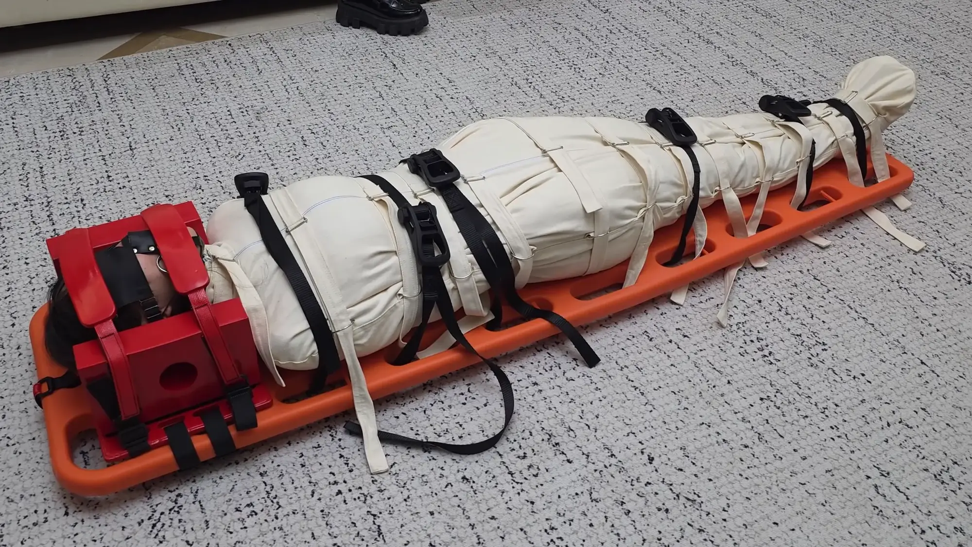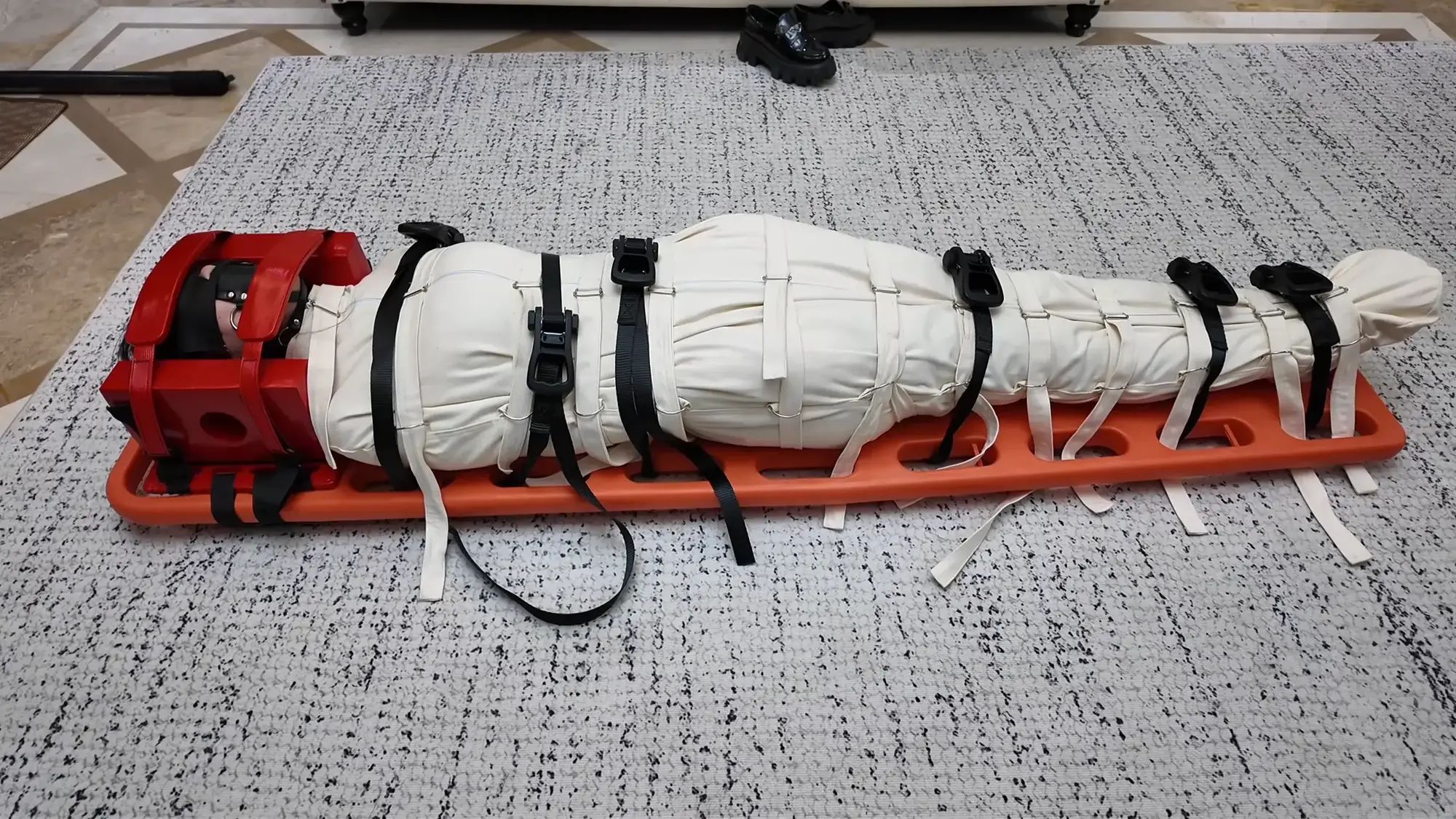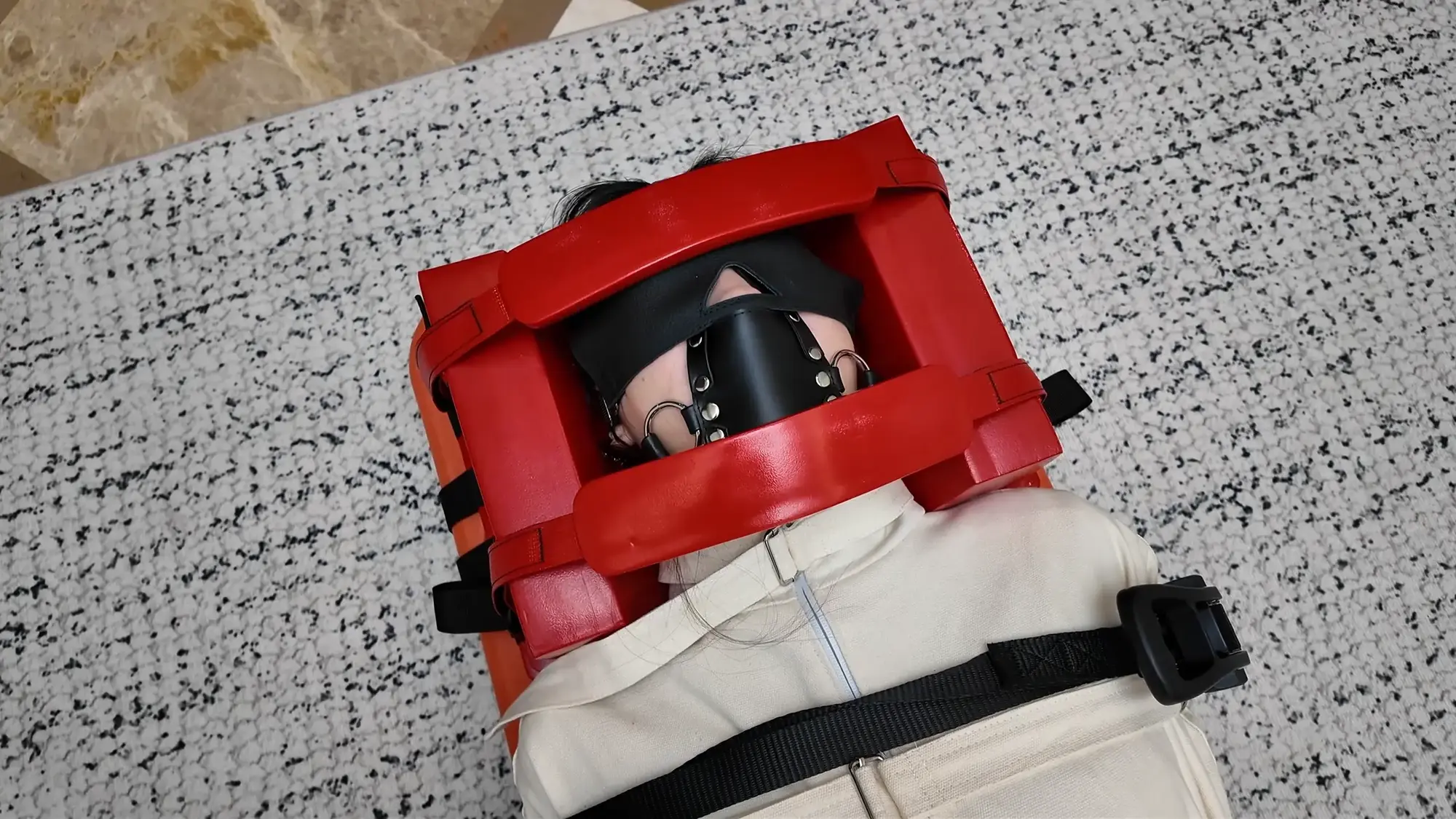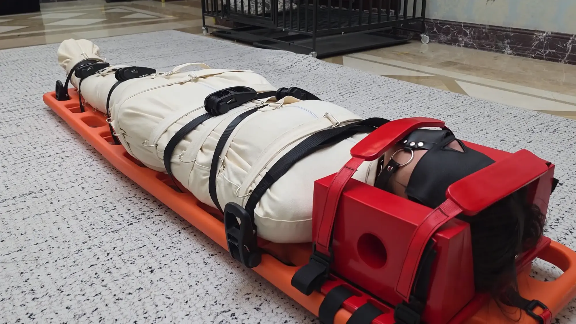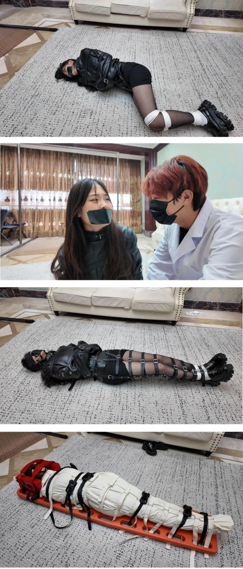 工作人员:话怎么这么多。说完就把口球塞在小斐嘴里,小斐腿也不断挣扎,工作人员就抓住她的腿,准备给她换上束腿器