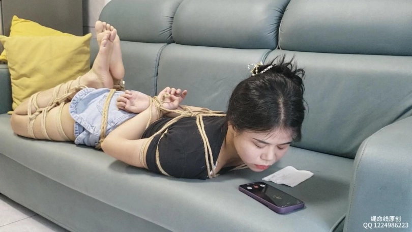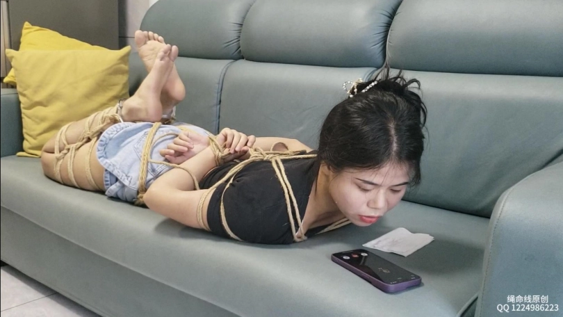 绑好后直接戴上口球,本来说放置个一小时让她自己挣扎,没想到中途来电话了,电话那方怎么也想不到安然被绑着跟她打的电话,安然也是边打电话边挣脱手上的束缚,谁知道又被上了一副手铐。