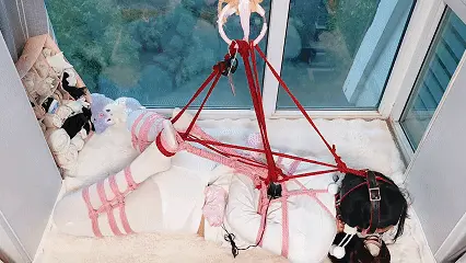 第五部分:露露双手被胶带包裹,从寻找到的道具里,一个[X_X]尾巴无情的[X_X]了后面,双脚的脚掌被捆绑在一起并吊起,并将驷马连接到头部使其强制仰头