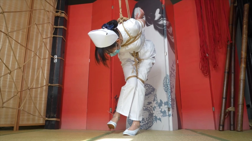 1.直臂,股绳 折腿缚,脚上穿着罚站道具!