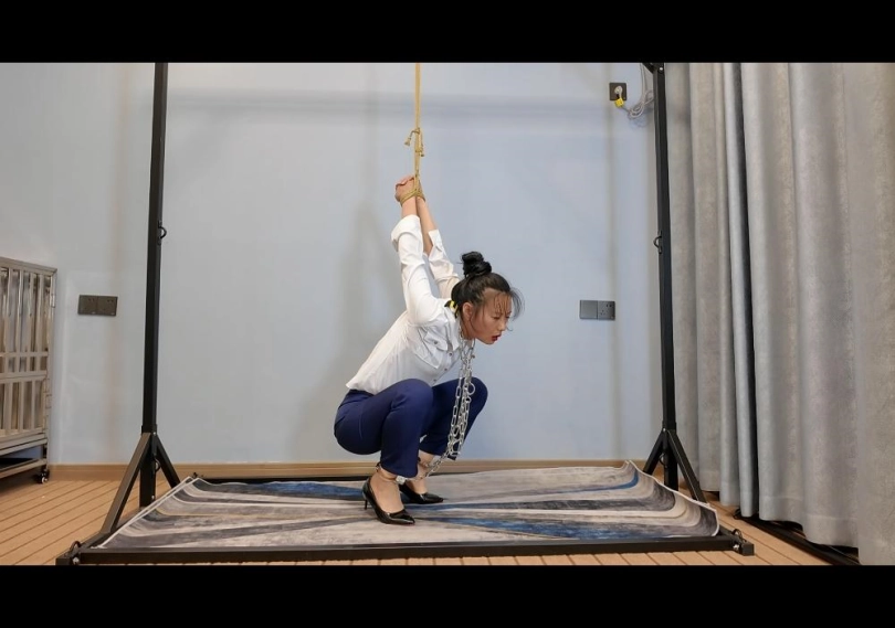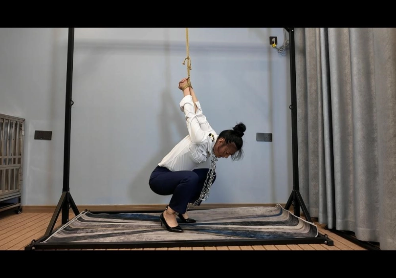 后手高高吊起,脖子用铁链子拴着,连到脚腕,脚腕也要带上手铐,这个姿势特别难受,还要求必须坚持一个小时,这家伙,可是把紫涵吊惨了,放下来说腰都快折了,躺地上休息了半天才起来