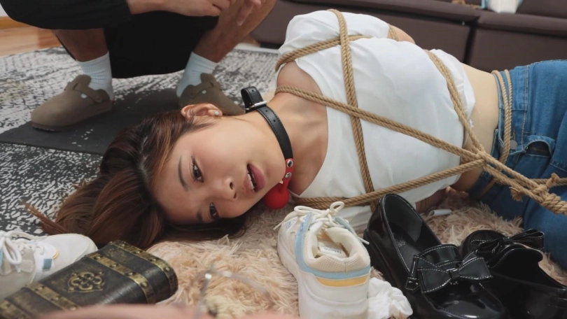 书接上回,安琪假意逃脱后与自己的同伙商议要将紫婷银行卡中密码套取出来,所以决定在紫婷面前使用苦肉计,故意让男劫匪将她抓回来后特殊关照,这次的拘束更加严密,不但用胶带包住了手指,甚至用驷马这种难以挣脱的姿势将二人重新加固,而逃脱未遂的安琪更是在此基础上被铐上手铐脚镣,已经取得紫婷信任的安琪被用作威胁紫婷的人质,顺利骗出银行卡密码后,男劫匪却并未按照约定解开安琪,而是上演了一出“连环计中计”。